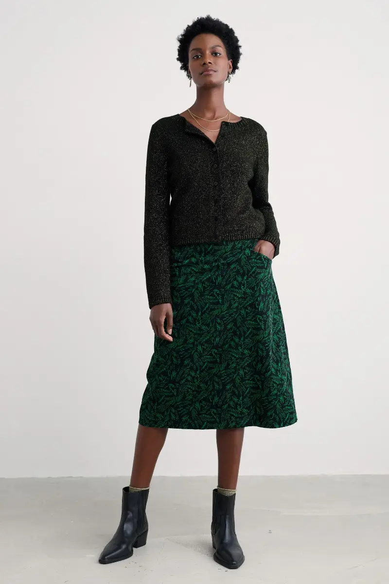 Printed cord A-line, below the knee skirt with angled pockets and concealed back zip.