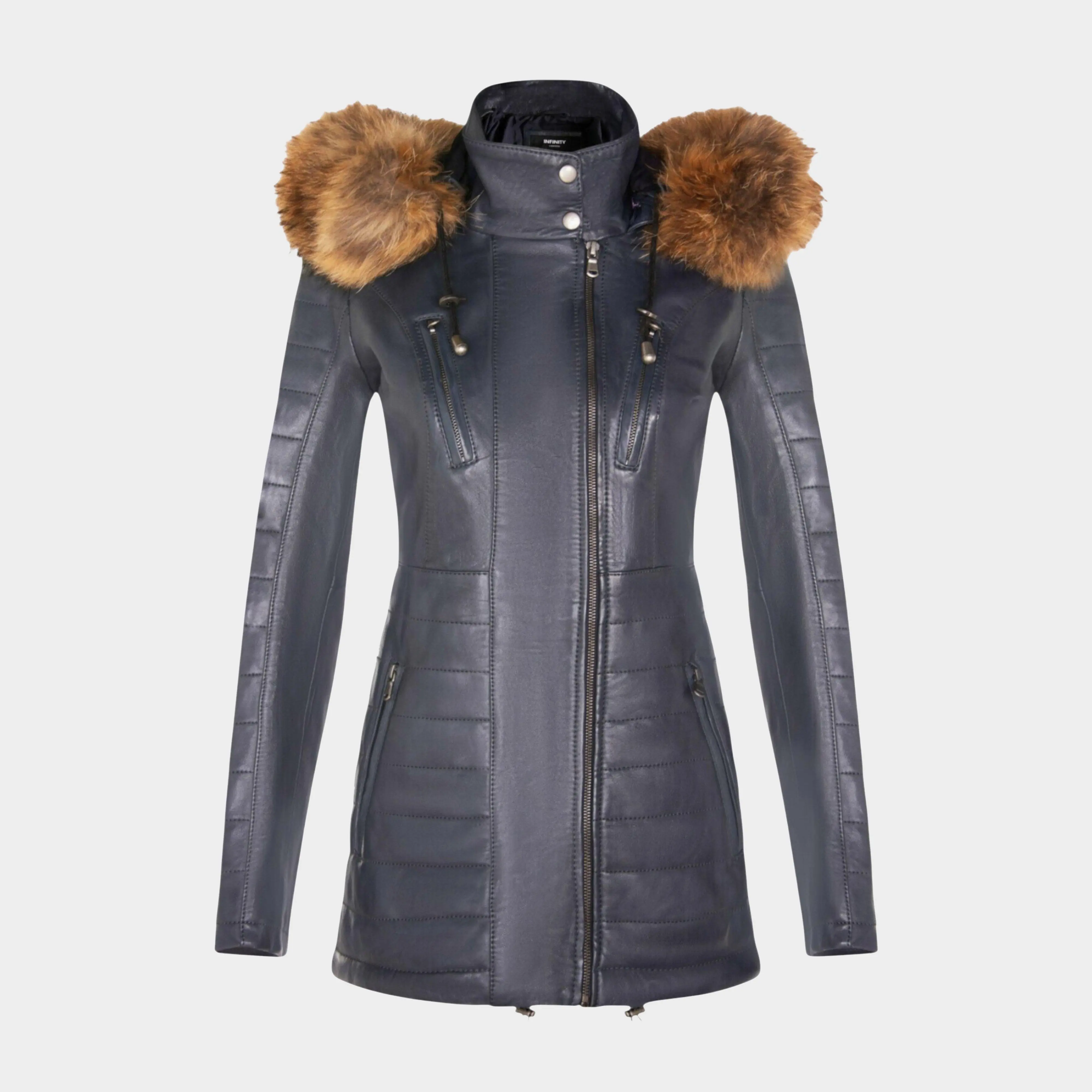 Elevate your winter wardrobe with our slim-fit Women's Leather Parka Jacket, a perfect choice for staying warm and stylish in colder weather. Crafted from 100% premium ultra-soft Nappa leather, this jacket offers a luxurious and comfortable feel._Here's what sets it apart:Detachable Fur-Lined Hood: The jacket features a detachable fur-lined hood, providing both warmth and an exuberant look that adds a touch of sophistication to your winter attire.Functional Zip Pockets: Four zip pockets on the jacket front, tabbed for easy opening, offer secure and convenient storage for your essentials.Luxurious Quilted Detailing: Quilted detailing on the sleeves and waist adds a touch of luxury and texture to the jacket's design, enhancing its visual appeal.High Stand Collar: The high stand collar, fastened with press studs, not only keeps you warm but also adds a chic and elegant element to the overall look.Zipped Cuffs: Zipped cuffs provide added adjustability and style, allowing you to customize the sleeve length according to your preference._This Women's Leather Parka Jacket combines fashion, functionality, and premium quality, making it a must-have addition to your winter wardrobe for a chic and cozy look.