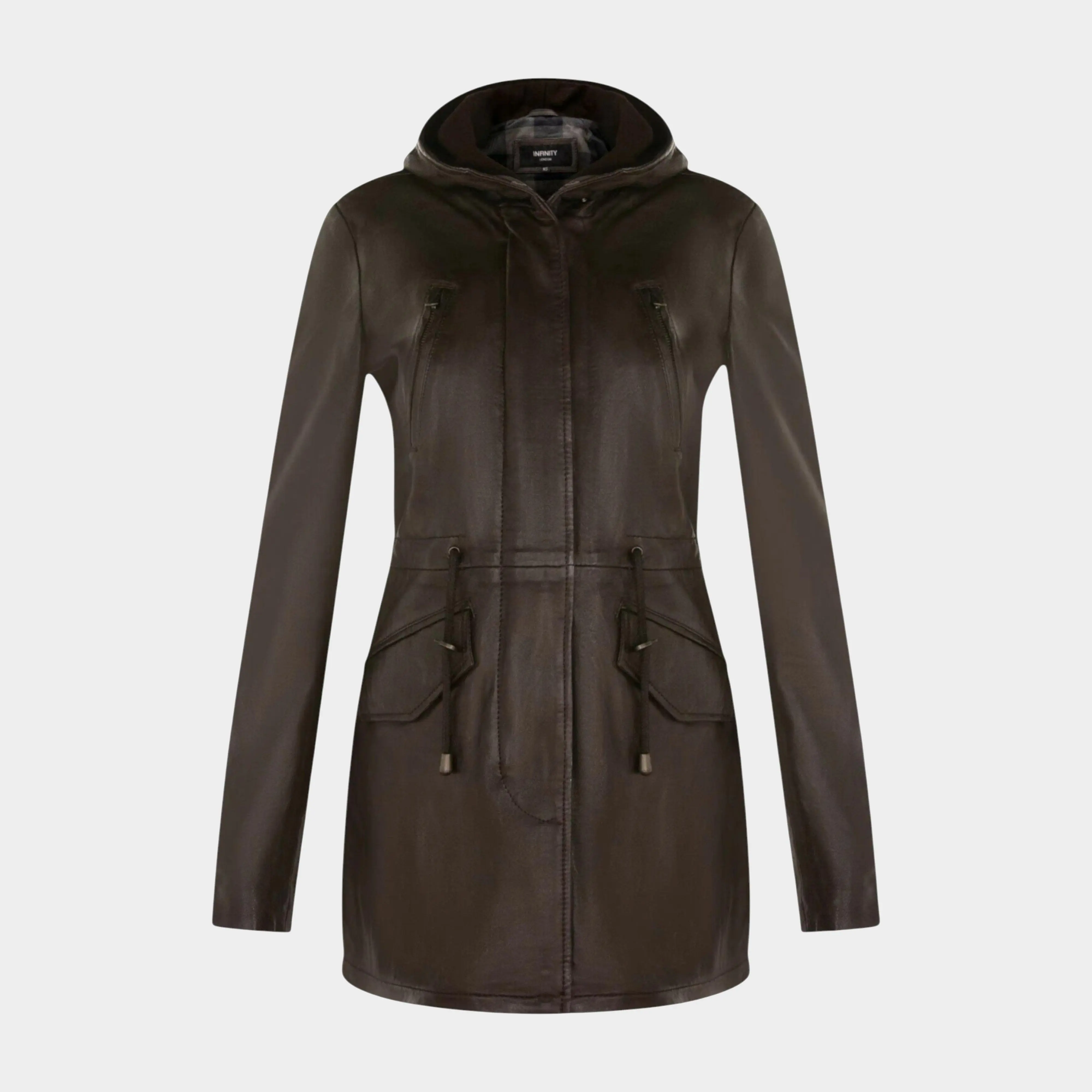 Infinity Leather Women's Mid Length Hooded Leather Parka Jacket, Brown