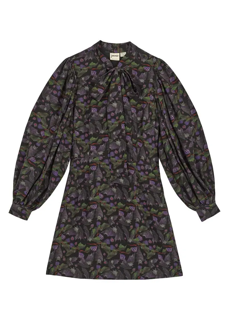 If you’ve got it, haunt it! The Nolly Dress is made from our favourite fabric with LENZING™ ECOVERO™ viscose fibres in an all-over gothic fruit bat print with illustrated figs and foliage on a classic black background. This goth girl LBD also features a pussy bow neck tie, long, exaggerated balloon sleeves with covered button cuffs, elasticated back-waist shirring and darts at the bust and waist to add shape, and a mini-length A-line skirt with slant pockets at the hips. Tao is 5'11 and is wearing a UK size 10Dellan is 5'9.5 and is wearing a UK size 16Regular fit - take your usual sizeUK Size 10 dress length: 89cmAll-over fruit bat printBlack backgroundPussy bow tieLong balloon sleevesA-line skirtMini lengthPocketsFor specific measurements of this garment, please see the Size Guide.