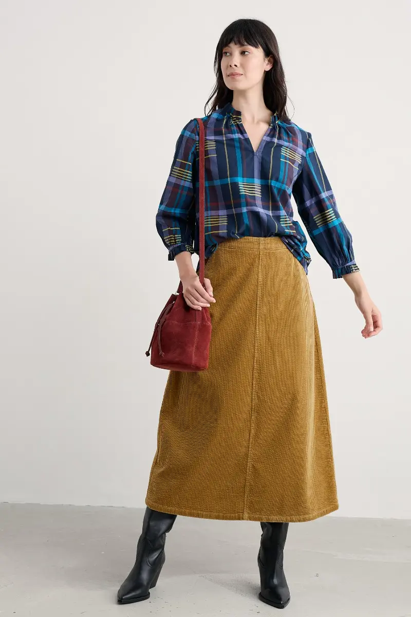 A velvety soft organic cotton cord A-line skirt, in a versatile midi length.
