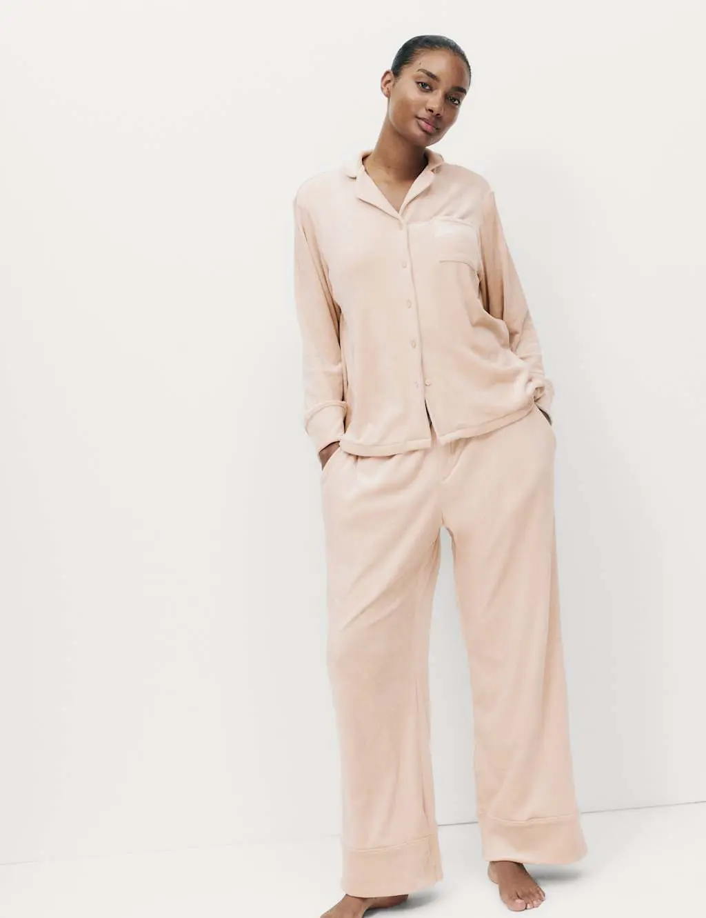 Snuggle up in style with this two-piece pyjama set, crafted from wonderfully cosy and soft fleece. Regular fit with comfy added stretch. Long-sleeved top has a button fastening and revere collar. The full-length bottoms are complete with an elasticated waist. M&S Collection: versatile styles in modern shapes with unique and playful details.