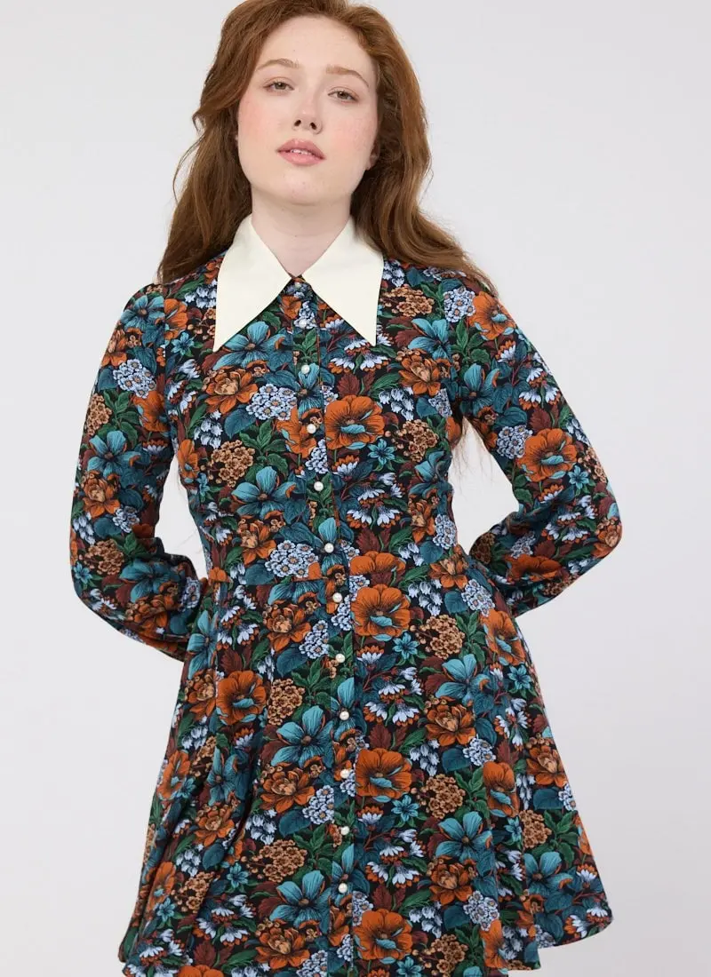 On Wednesdays, we wear Jenna! Our go-to goth girl staple is back in a brand-new dark floral print with illustrated oversized giant flowers in shades of rust and blue on a classic black background. The Jenna Dress also features a contrasting dagger collar, a functional button-down front with pearl drop buttons, long balloon sleeves with pearl drop button cuffs, an elasticated panel at the back to add shape, a knee-grazing circle skirt, and pockets at the hips.Olivia is 5'7 and is wearing a UK size 10Elena is 5'10 and is wearing a UK size 16Regular fit - take your usual sizeUK Size 10 dress length: 90cmAll-over dark floral print Black backgroundPearl drop buttonsLong balloon sleevesElasticated back panelMini lengthFor specific measurements of this garment, please see the Size Guide.