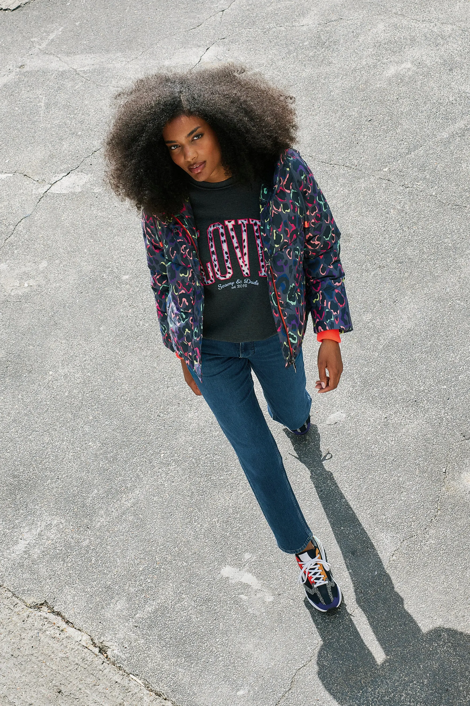 Cosy up in our rainbow leopard print puffer coat, your AW25 wardrobe staple. Designed with a shorter length, throw this on over anything from loungewear to jumpers and jeans or dresses. Shorter length rainbow leopard print puffer coat Borg lined hood Water resistant Neon coral ribbed cuffs Zip and popper fastening Neon coral zip tape Lightning bolt zip Black lining with coral piping Drawcords at waist Fleece lined side pockets Signature neon pink embroidered lightning bolt on sleeve Also available in a longer length Model 1 is Size 8-10 Height 5'9" Wearing a size 8 Model 2 is Size 10 Height 5'8.5" Wearing a size 8