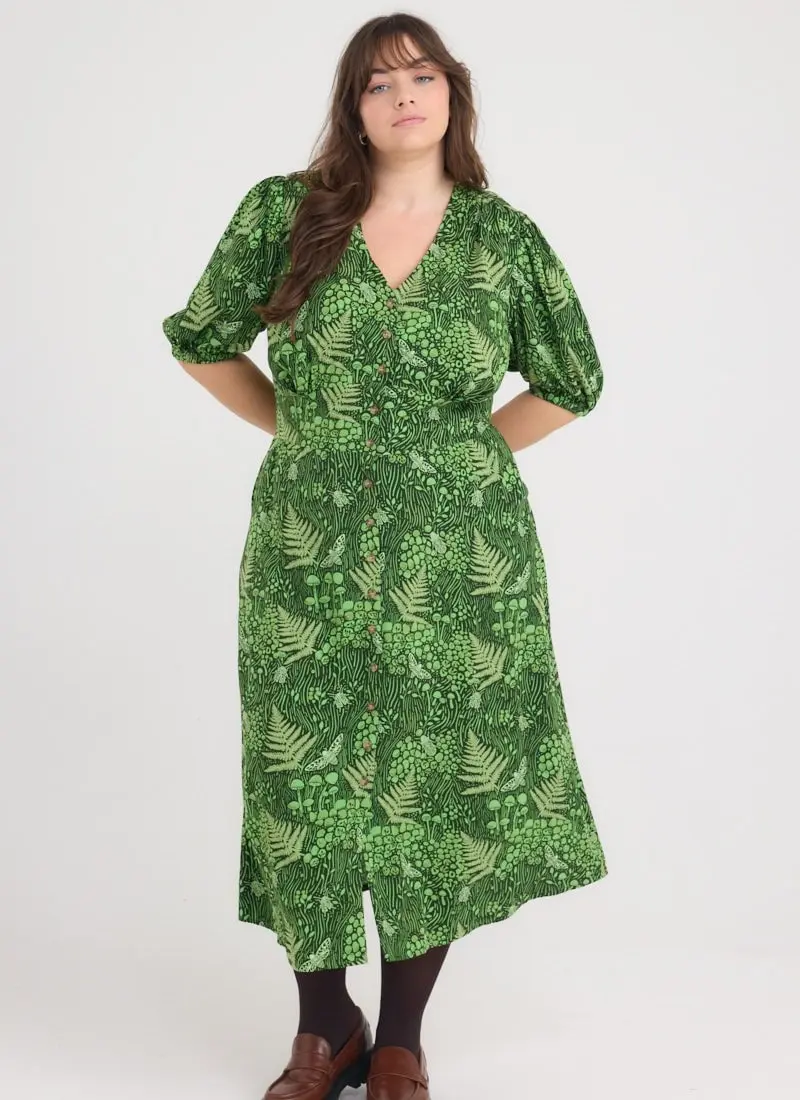 Rebecca’s here to make the rest of your day dresses green with envy! This easy-to-style midi is made from our favourite fabric with LENZING™ ECOVERO™ viscose fibres in an all-over all-over leafy forest floor print with foliage, beetles, and mushrooms on a deep green background. The Rebecca Dress also features a V-neckline, elbow-length voluminous puff sleeves with elasticated cuffs and gathers at the shoulder, a shaped front waist panel with gathers around the bust to add shape, a functional button-through front with horn-effect buttons, elasticated shirring at the back waist, and a slim skirt with slant pockets at the hips.Sixtine is 5'7 and is wearing a UK size 16Regular fit - take your usual sizeUK Size 10 dress length: 120cmAll-over leafy forest intarsia designV-necklineElbow-length puff sleevesFunctional button-down frontHorn-effect buttonsMidi lengthPocketsFor specific measurements of this garment, please see the Size Guide.