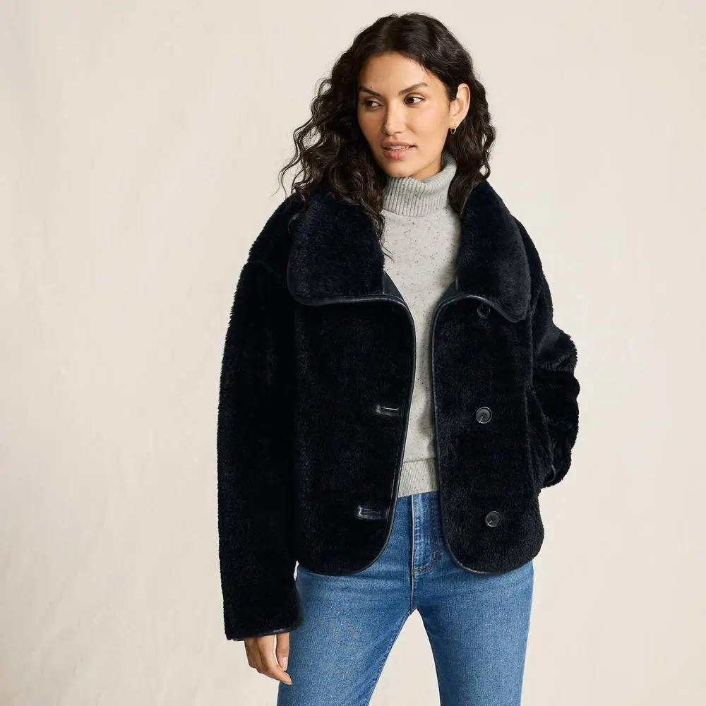 Add instant luxury to your look with this chic short faux fur jacket. Featuring a statement collar, relaxed dropped shoulders, and a smooth button fastening, it blends effortless style with cosy comfort. Side pockets keep hands warm, making it perfect for day-to-night wear when the temperature drops. | Lands' End Women's Short Faux Fur Jacket in Black | Size: 8