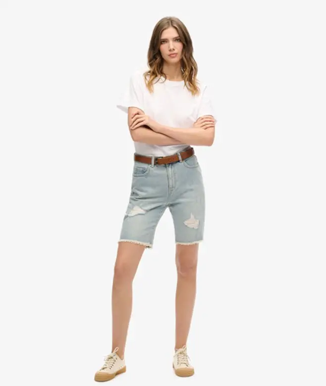 Superdry women's Bermuda boy shorts. These denim boy shorts features a classic five pocket design, belt loops and a zip and button fastening. Finished with stitching detailling and a Superdry patch logo on the back of the waistband.