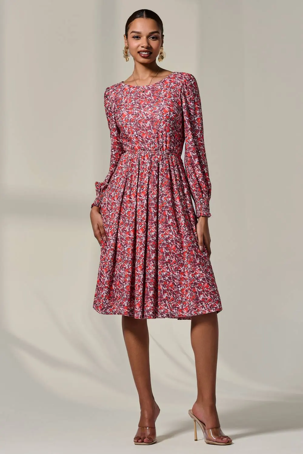 Sophisticated and elegant, the Long Sleeve Jersey Midi Dress from Jolie Moi is everything youve been wanting and more, adorned in the most perfect orange floral print, which dances across a soft and stretchy jersey material, making it super comfortable whilst still looking your best. Featuring a pleated skirt which falls to the perfect length, as well as a comfortable elasticated waistband which can be cinched in with the tie belt at the back, this piece will turn heads at any occasion. The long sleeves are a flattering shape, with shirred wrist detailing and subtle ruching at the shoulder. It also has a practical centre back zip, and discreet side front pockets, and full lining for extra comfort. | Jolie Moi Women's Long Sleeve Jersey Midi Dress | Size: 8