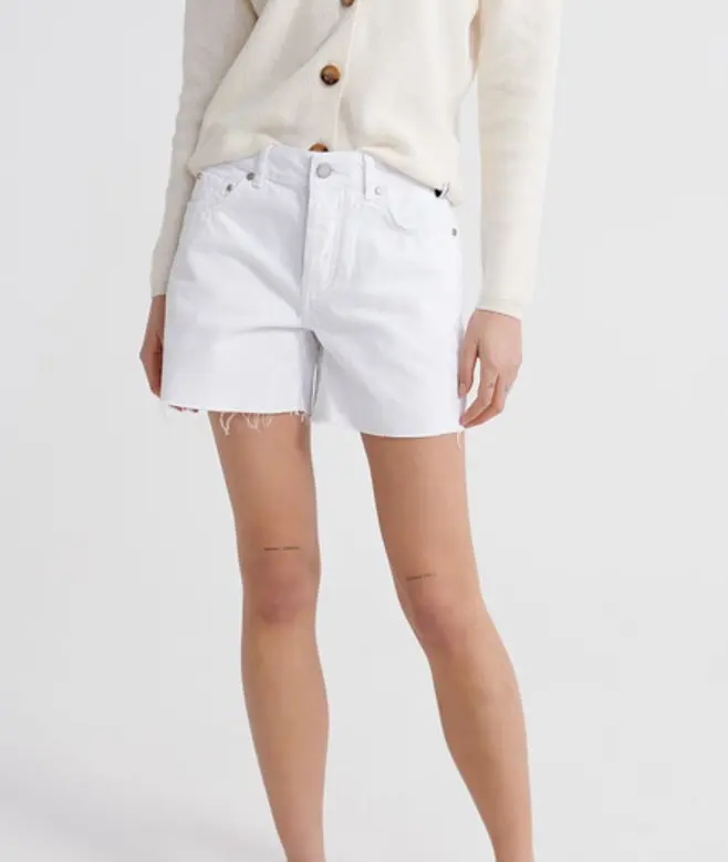 Superdry women's Denim Mid Length shorts, These shorts feature a classic five pocket design, a button and zip fastening, belt loops and a raw hem. These shorts are complete with a Superdry logo patch on the back of the waistband.