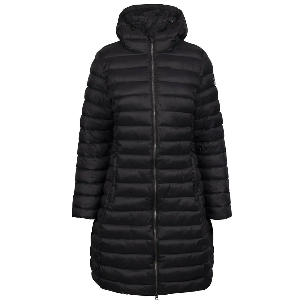 Shell: Polyamide. Lining Material: 100% Polyamide. Filling Material: 100% Polyester. Design: Badge, Logo, Quilted. Fabric Technology: Durable, Lightweight. Fake Down Insulation, Inner Storm Flap, Stitched Baffles, Unrestricted Movement. Neckline: Hooded. Sleeve-Type: Long-Sleeved. Hood Features: Grown On Hood, Toggle Adjuster. Length: Long. Pockets: 2 Front Pockets, Zip. Fastening: Full Zip, Two Way Zip. XS: 32 in. S: 34 in. M: 36 in. L: 38 in. XL: 40 in. XXL: 42 in. | Trespass Women's Dorothea Padded Jacket in Black | Size: Small