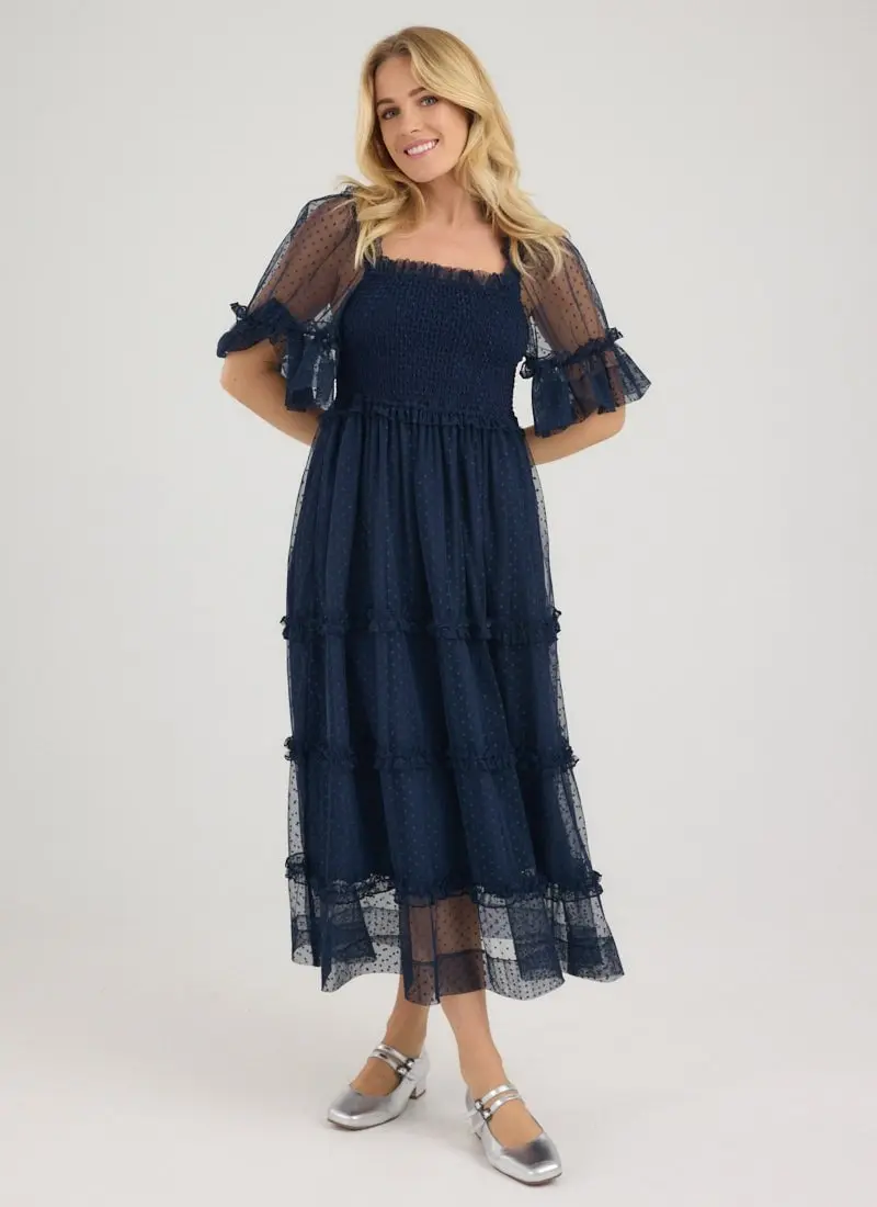 Party perfection. The Jemima Dress is made from navy blue Swiss dobby polka dot mesh fabric with lining to the bodice and skirt, and features a square neckline with elastic at the sleeve edge, wide, floaty sleeves with frill detail, an elasticated, shirred bodice, and a midaxi-length skirt with frill detail and pockets at the hips.Harriet is 5'8 and is wearing a UK size 10Romi is 5'6 and is wearing a UK size 16Regular fit - take your usual sizeUK Size 10 dress length: 125cmSwiss dobby meshSquare necklineElasticated bodiceMidaxi-length skirt PocketsFor specific measurements of this garment, please see the Size Guide.