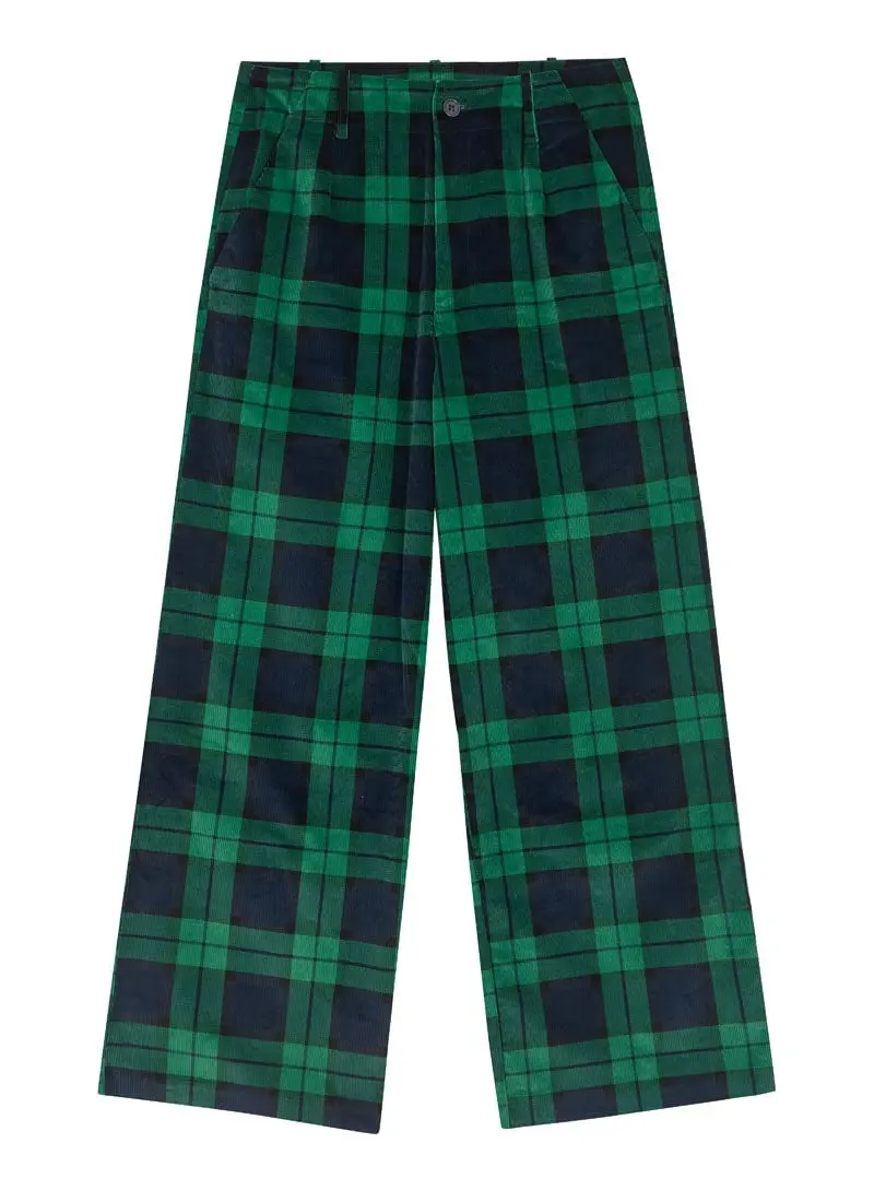 Checkmate. The Pip Trousers are made from a heavyweight organic cotton corduroy stretch fabric in an all-over navy and green tartan check print and feature a high waistline with a black plastic button and metal zip closure, functional belt loops for your favourite vintage belt, slant pockets, and wide legs. Pair with the matching Frank Blazer for a touch of coordinated cool, or tuck in a vintage tee for a more laid-back look!Harriet is 5'8 and is wearing a UK size 10Romi is 5'6 and is wearing a UK size 16Regular fit - take your usual sizeInside leg length: 60cmOrganic cotton corduroyNavy and green tartan check printHigh waistlineSlant pocketsWide legsMatching blazer availableFor specific measurements of this garment, please see the Size Guide.