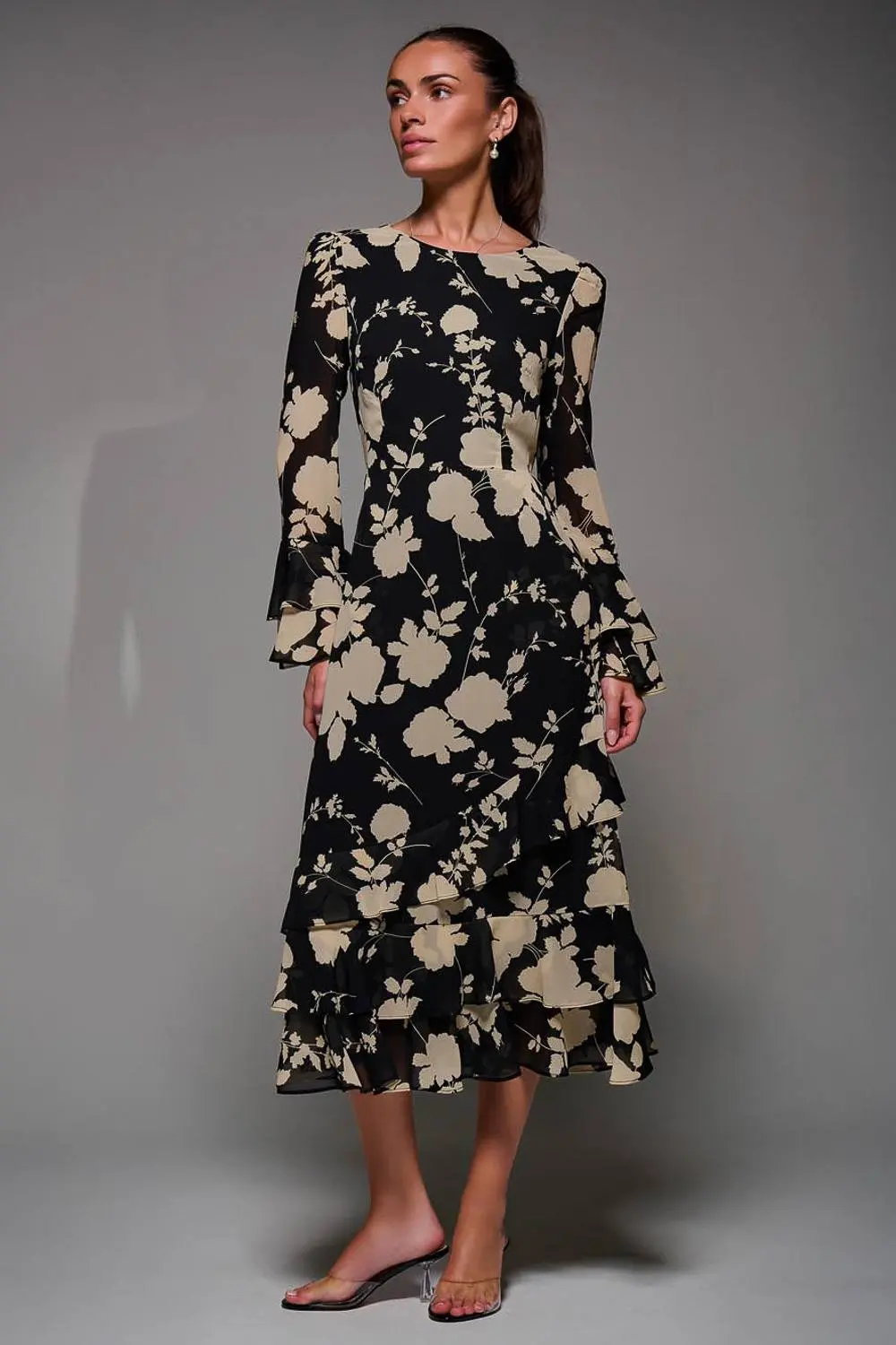 This Long Sleeve Frill Chiffon Midaxi Dress by Jolie Moi features a round neckline at the front and a flattering V-neckline at the back, fastened with a concealed zip and tie. The sleeves are adorned with two frills, and the hem is finished with a three-tier frill, complemented by two functional pockets. | Jolie Moi Women's Long Sleeve Frill Chiffon Midaxi Dress in Black | Size: 8