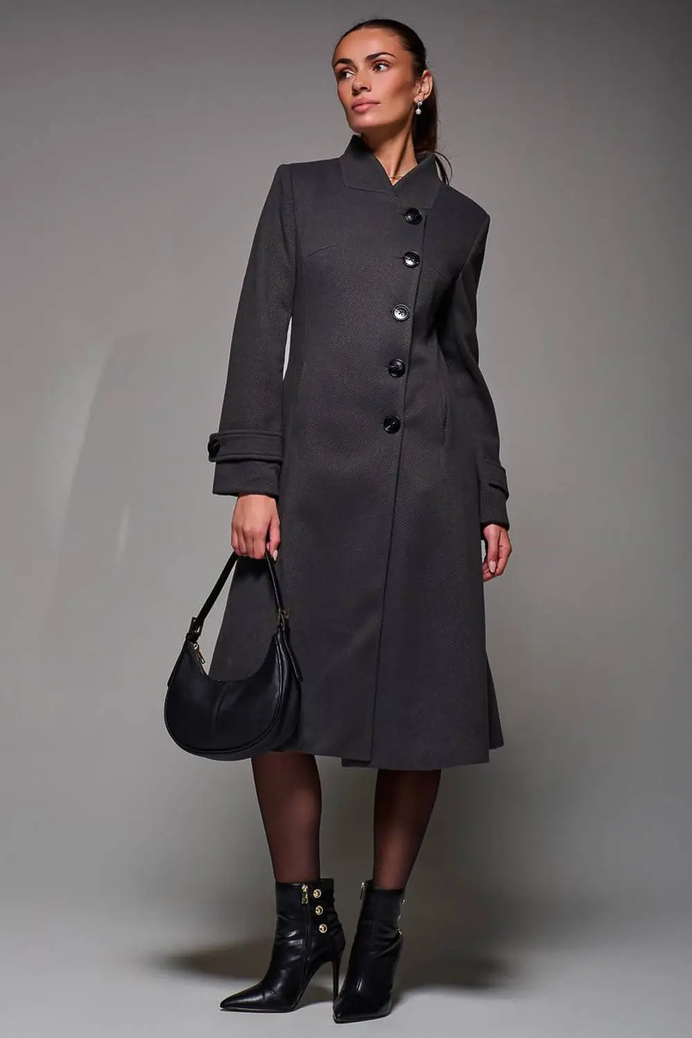 Jolie Moi Women's Asymmetric Button Detail Fit & Flare Coat in Dark Grey