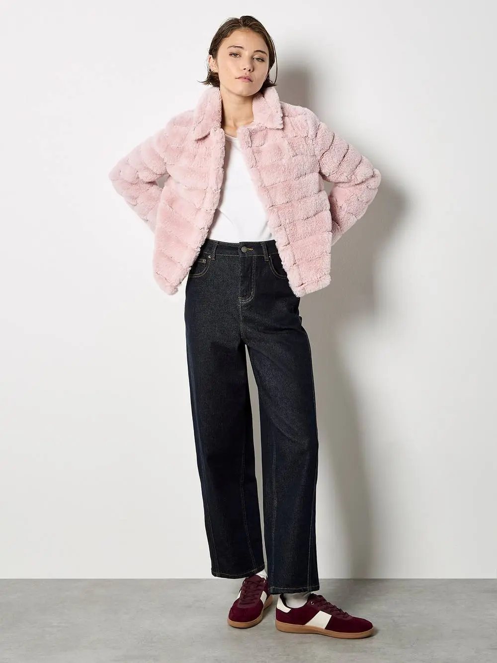 Cosy up in comfort and style with this soft, faux fur jacket. Lined for comfort, it boasts a panel design, one snap-button fastening, and side seam pockets. | Apricot Women's Faux Fur Panel Short Jacket in Pink | Size: 12