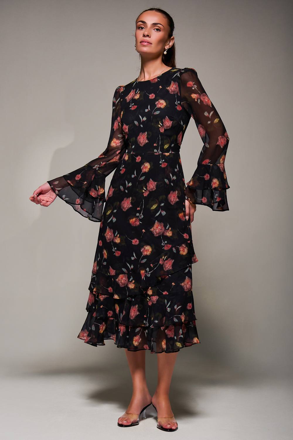 This Long Sleeve Frill Chiffon Midaxi Dress by Jolie Moi features a round neckline at the front and a flattering V-neckline at the back, fastened with a concealed zip and tie. The sleeves are adorned with two frills, and the hem is finished with a three-tier frill, complemented by two functional pockets. | Jolie Moi Women's Long Sleeve Frill Chiffon Midaxi Dress | Size: 8