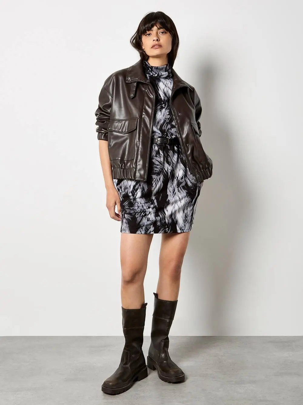 Designed in stretch jersey, this cocoon mini dress combines comfort and style. Framed by a mock neck and batwing sleeves, it boasts a bold feather print and practical side seam pockets. | Apricot Women's Feather Print Jersey Cocoon Mini Dress in Grey | Size: 14