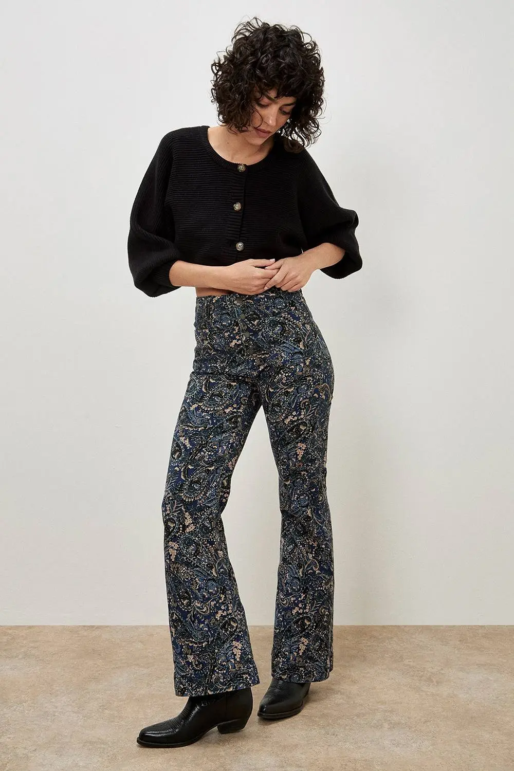 Work timeless boho prints into your weekend wardrobe with these paisley jeans. With a flattering high-rise waist, they feature four button fastenings, four patch pockets, and a flared cut for a retro-inspired finish. | Apricot Women's Paisley Print High Waist Flare Jeans in Blue | Size: 30