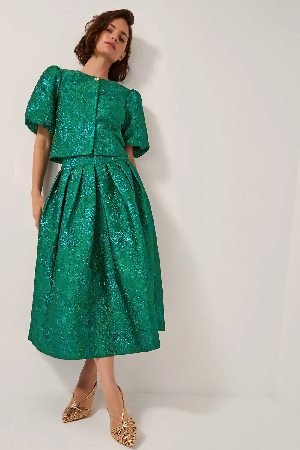 There's no skirting around this. Showcasing eye-catching jacquard florals in emerald green and iridescent teal, this midi skirt is a statement partywear pick for the maximalists. Designed with box pleats under the high waistband for a voluminous finish, it's also got side pockets (big yes)! Want to up the ante? There's also a matching jacket... Green | Monsoon Women's Jolene Floral Jacquard Midi Skirt Green | Size: 8