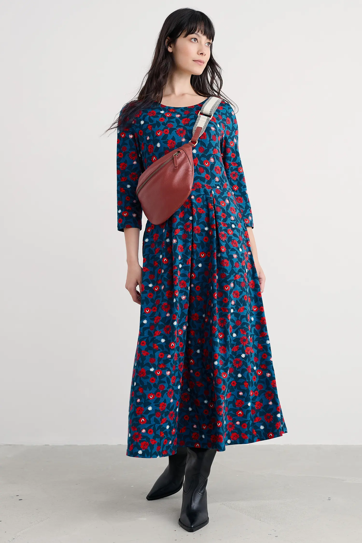 Printed midi length dress in soft organic cotton jersey, with handy pockets.