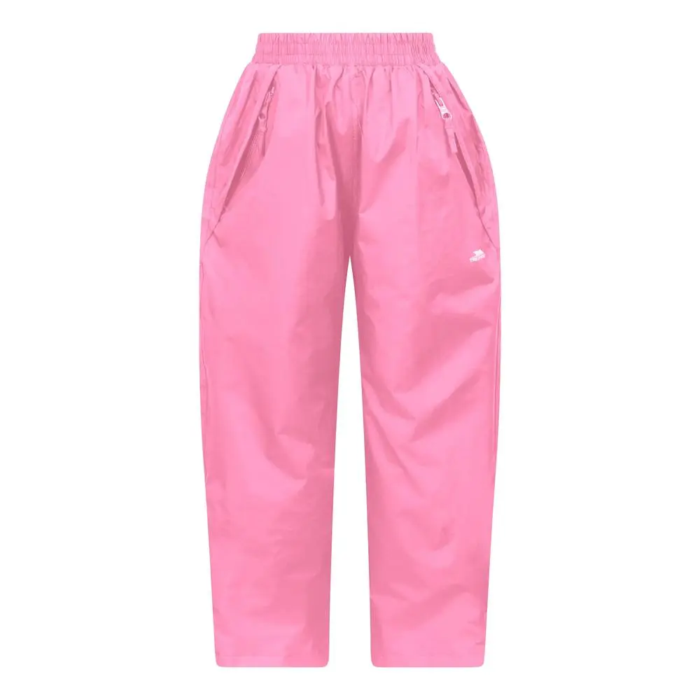 Design: Logo, Plain. Fabric Technology: Breathable, Waterproof, Windproof. Taped Seams. Pockets: 2 Side Pockets, Zip. Waistline: Elasticated. Waterproof Rating: 2000mm. Hem: Stud. | Trespass Echo Waterproof Trousers in Pale Pink | Size: 11-12 Years