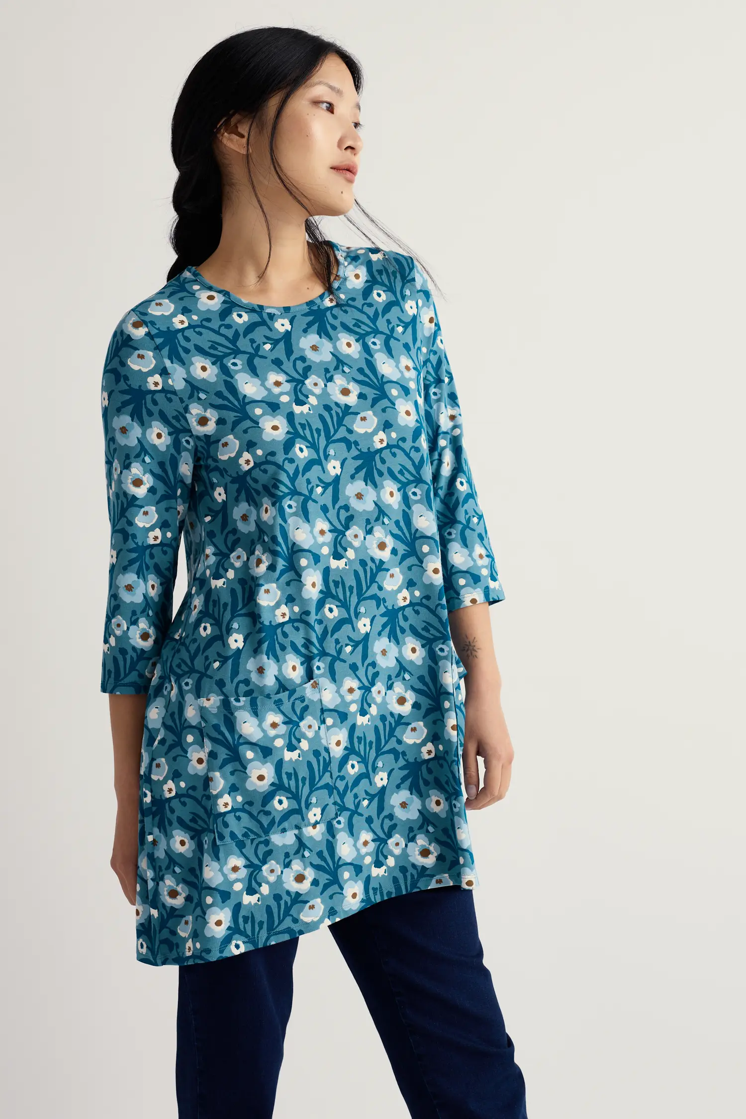 Easy-to-wear bamboo jersey women's tunic top. Falling to mid-thigh, it has 3/4 length sleeves & scoop neck. Great with leggings, jeggings or slim-fit trousers.