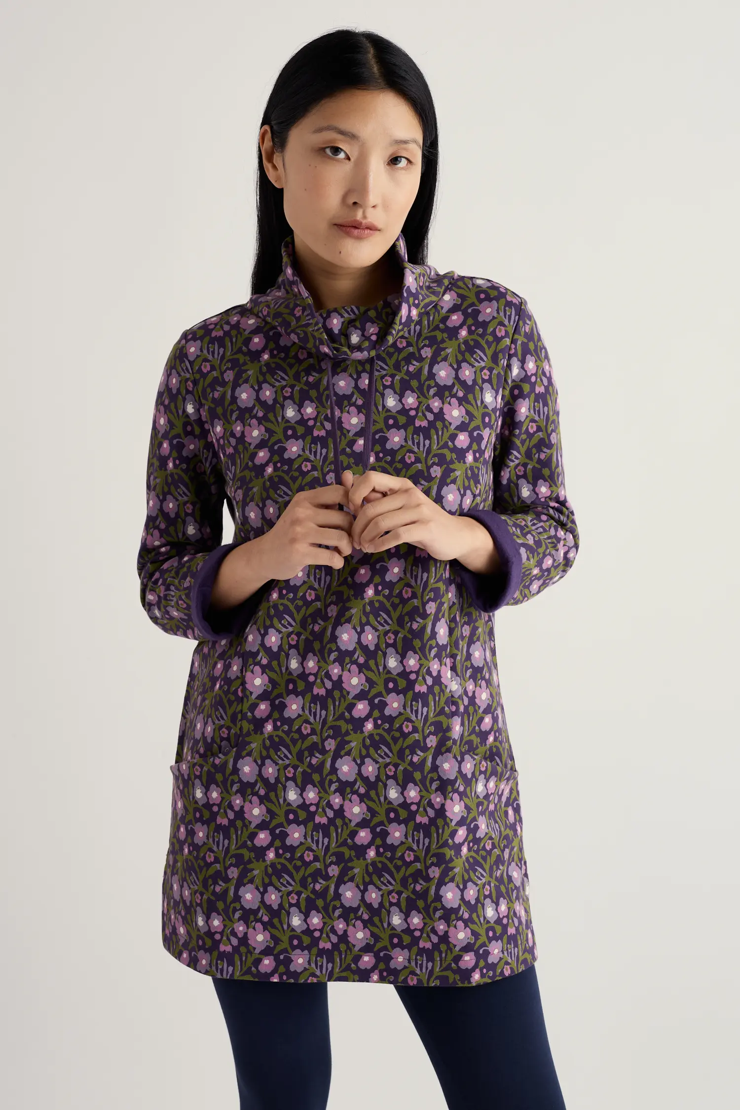 Soft sweater dress tunic with a stand neckline, for days when ease and comfort are key.