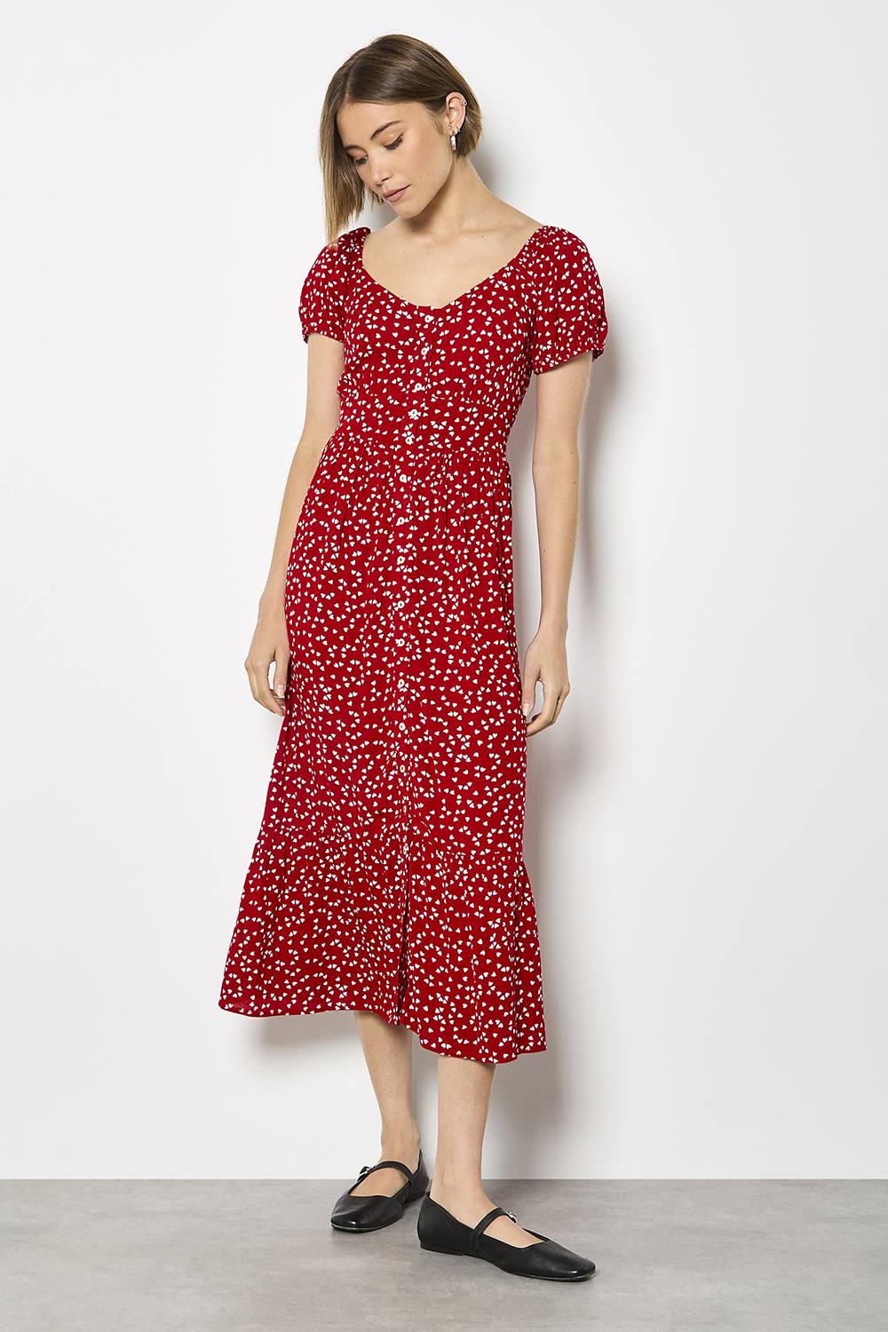 With its ditsy heart print and lightweight, woven finish, this midi is a must-have on warm days. Framed by puff sleeves and a wide V-neck, it boasts a button-down front, a smocked back, and practical side seam pockets. | Apricot Women's Mini Heart Print Midi Dress in Red | Size: 14