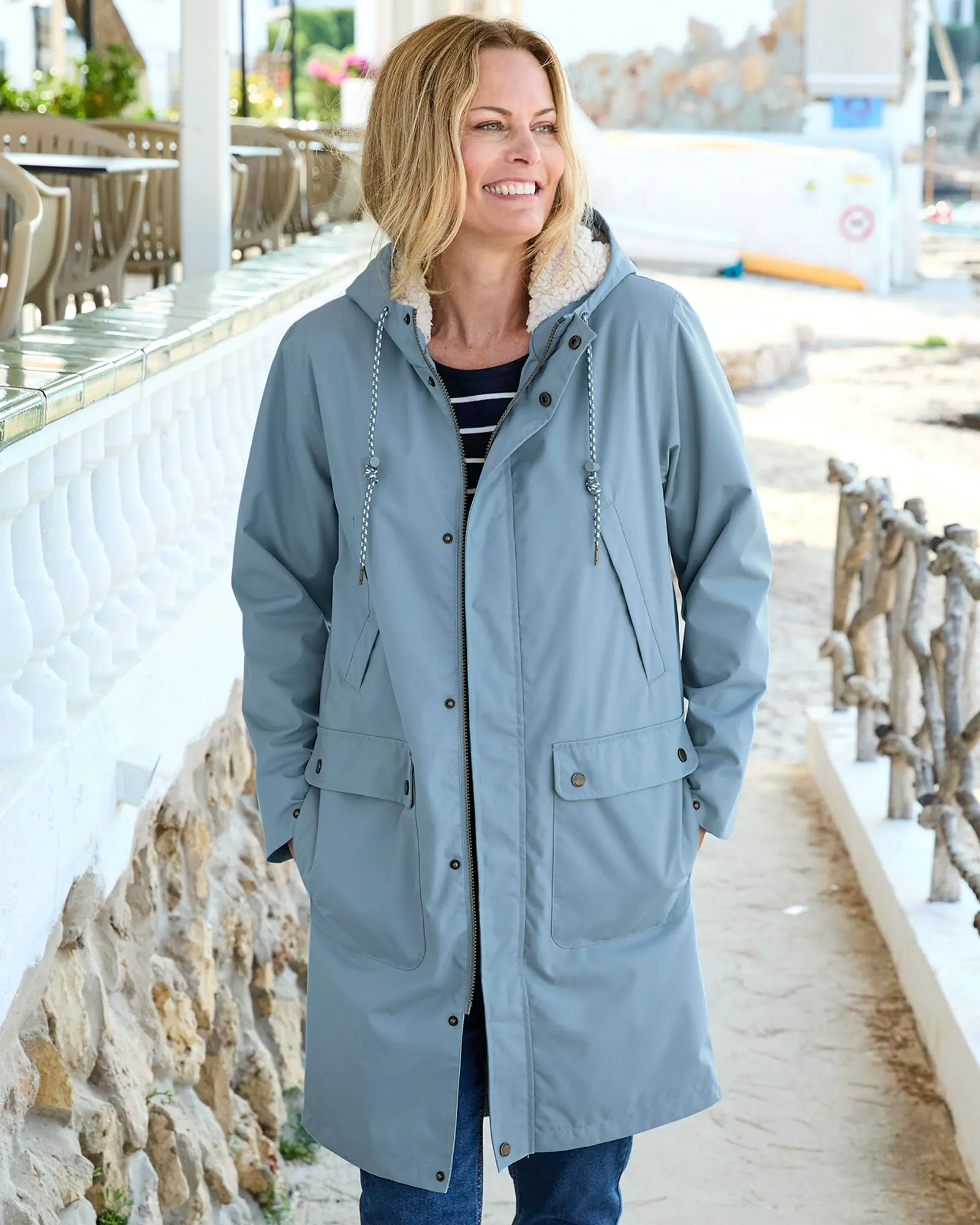 Fully waterproof with a breathable finish and taped seams for extra protection Teddy fleece lined for added comfort and warmth Hood with adjustable drawcord Twin two-way entry patch pockets with popper flap fastenings to the lower body Twin slanted chest pockets Single inner pocket with zip fastening Zip-through front with popper-fastening storm flap. Drop curved hem at the rear Adjustable popper tab fastening to the wrists The perfect companion in a downpour, this breathable jacket is ideal for spring walks, keeping you dry and comfortable as the seasons change. With a teddy fleece upper body lining, waterproof taped seams, and a popper fastening storm flap over the Cotton Traders embossed zip front, even the heaviest showers are no match for the Moorland Jacket. A peaked hood (with its handy adjustable drawcord) helps keep the rain off your face and promises a perfectly personalised fit. To complete the look, we’ve added two-way twin pockets to the lower body, twin slanted chest pockets to warm your hands and a zip fastening inner pocket for all your essentials. Machine Washable100% Polyester | Cotton Traders Fleece Lined Moorland Jacket in Blue, 100% Polyester, Size Small