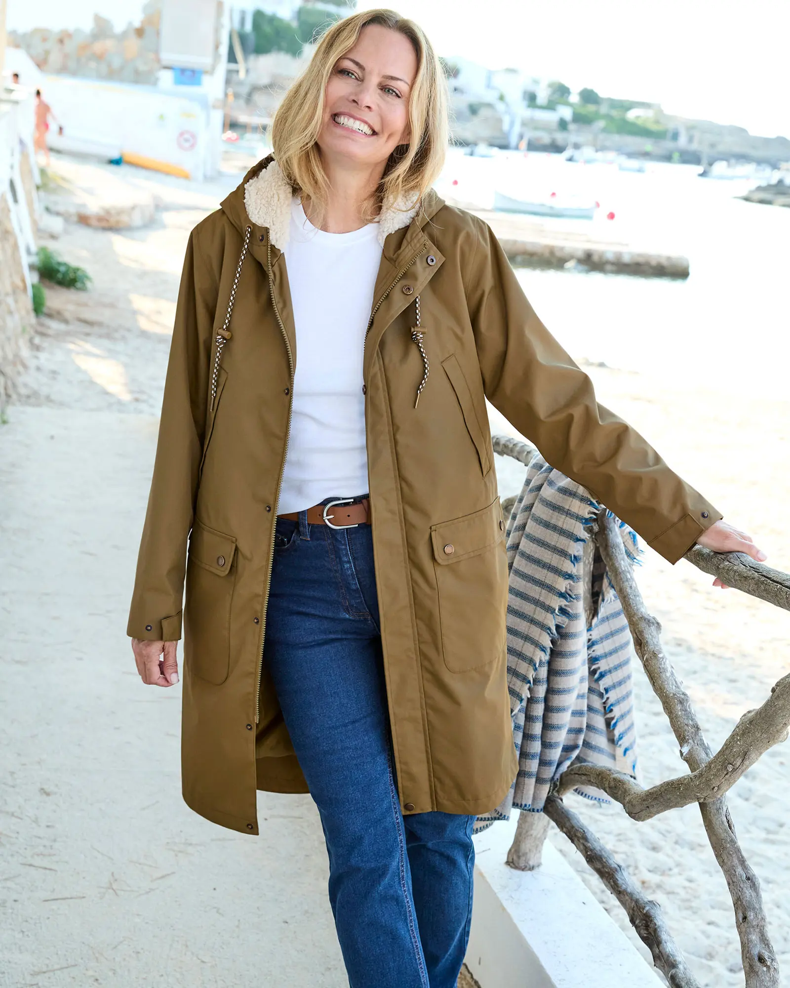 Fully waterproof with a breathable finish and taped seams for extra protection Teddy fleece lined for added comfort and warmth Hood with adjustable drawcord Twin two-way entry patch pockets with popper flap fastenings to the lower body Twin slanted chest pockets Single inner pocket with zip fastening Zip-through front with popper-fastening storm flap. Drop curved hem at the rear Adjustable popper tab fastening to the wrists The perfect companion in a downpour, this breathable jacket is ideal for spring walks, keeping you dry and comfortable as the seasons change. With a teddy fleece upper body lining, waterproof taped seams, and a popper fastening storm flap over the Cotton Traders embossed zip front, even the heaviest showers are no match for the Moorland Jacket. A peaked hood (with its handy adjustable drawcord) helps keep the rain off your face and promises a perfectly personalised fit. To complete the look, we’ve added two-way twin pockets to the lower body, twin slanted chest pockets to warm your hands and a zip fastening inner pocket for all your essentials. Machine Washable100% Polyester | Cotton Traders Fleece Lined Moorland Jacket in Brown, 100% Polyester, Size Small
