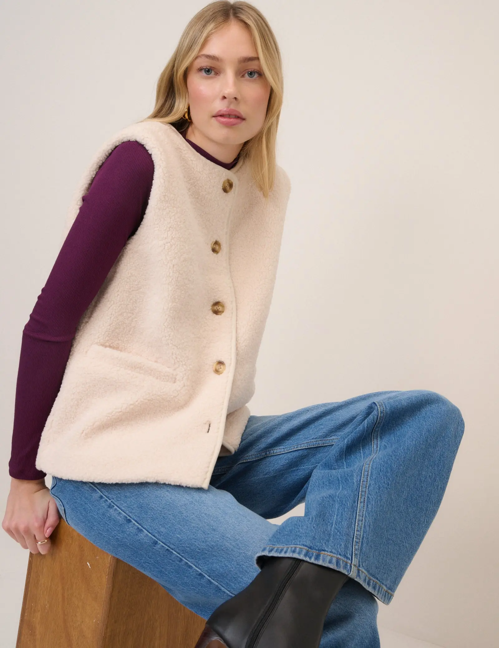 Round neck Sleeveless Mock horn button front Patch pockets Relaxed fit Size tip: we recommend your usual size