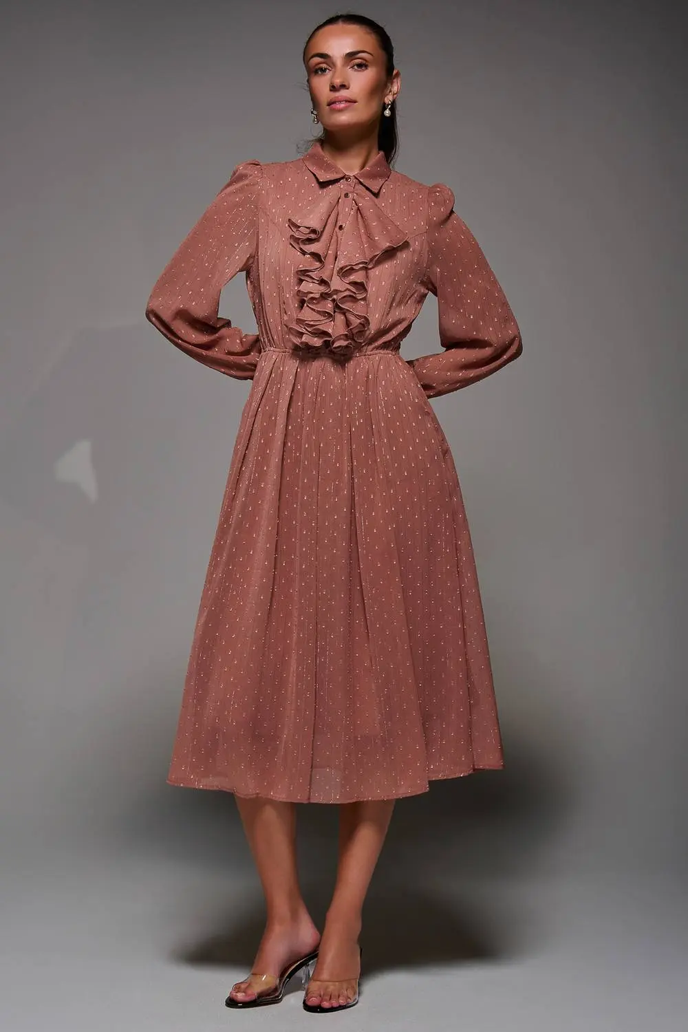 The Textured Chiffon Ruffle Shirt Dress by Jolie Moi features a classic shirt-style collar with cascading frills from the neckline to the waist. Designed in a flattering fit and flare shape, it includes a tie detail at the waist and a softly gathered waistband for gentle structure. Finished with long sleeves with shirred cuffs, two handy pockets, and a subtle glitter finish woven through the fabric for a touch of shimmer | Jolie Moi Women's Textured Chiffon Ruffle Shirt Dress in Dark Pink | Size: 12