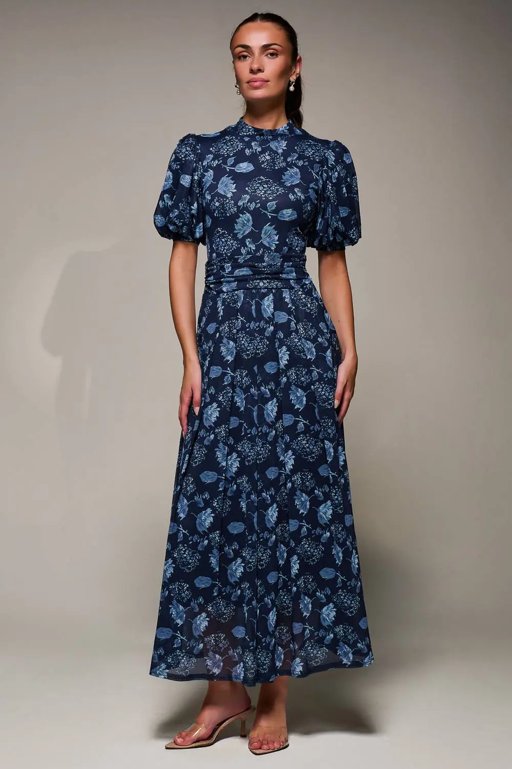 The Puffy Sleeve Printed Mesh Maxi Dress is your next wardrobe staple, perfect for your next autumn wedding. Adorned in a unique print, the soft mesh fabric cascades down to the perfect midmaxi length, complimented by the pleated skirt detailing around the waistband. The high neckline is a classic yet refined feature of this dress, contrasting with the short puffy sleeves which gives this dress a fun and feminine edge. The thick ruched waistband gives this dress a nice structure whilst also being comfortable, being an over the head style which is fully lined. Lastly, the discreet side front pockets add a practical touch. | Jolie Moi Women's Puffy Sleeve Printed Mesh Maxi Dress in Navy | Size: 16