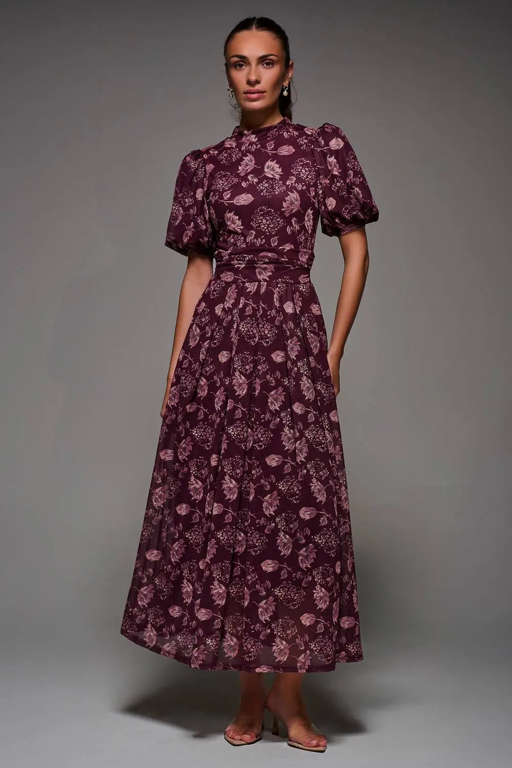 The Puffy Sleeve Printed Mesh Maxi Dress is your next wardrobe staple, perfect for your next autumn wedding. Adorned in a unique print, the soft mesh fabric cascades down to the perfect midmaxi length, complimented by the pleated skirt detailing around the waistband. The high neckline is a classic yet refined feature of this dress, contrasting with the short puffy sleeves which gives this dress a fun and feminine edge. The thick ruched waistband gives this dress a nice structure whilst also being comfortable, being an over the head style which is fully lined. Lastly, the discreet side front pockets add a practical touch. | Jolie Moi Women's Puffy Sleeve Printed Mesh Maxi Dress in Burgundy | Size: 12