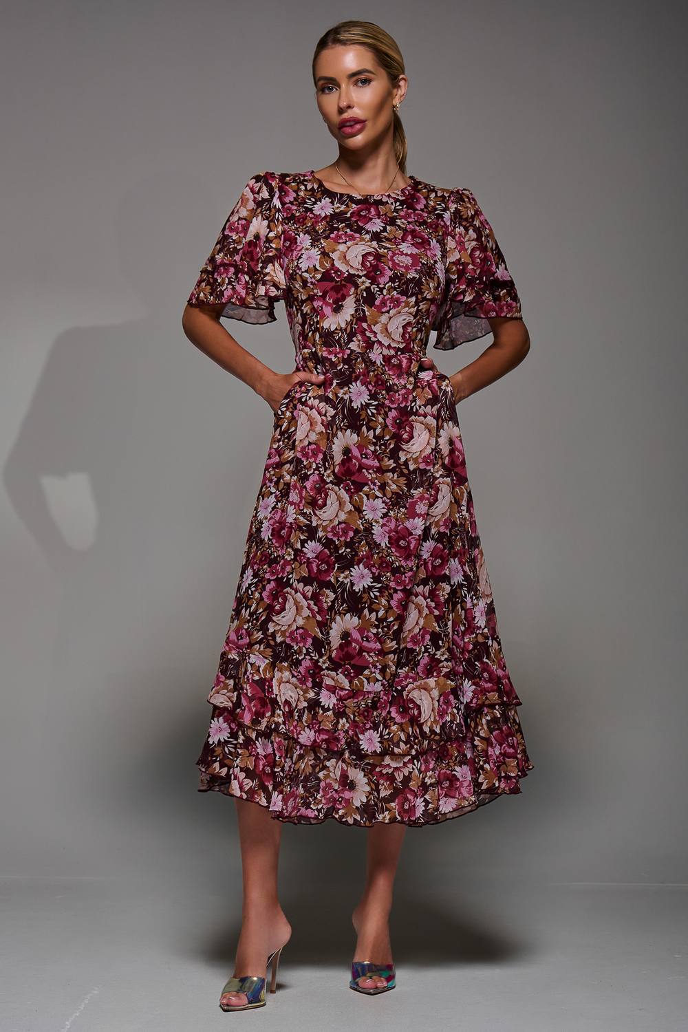 The Frill Detail Chiffon Midaxi Dress by Jolie Moi features a round neckline, a flattering tie waist, and a concealed zip at the back. Soft, 2-layer short flowy sleeves and a double-frilled hem add a graceful, romantic touch. Finished with practical side pockets, its a versatile piece perfect for both day and evening occasions. | Jolie Moi Women's Frill Detail Chiffon Midaxi Dress | Size: 10