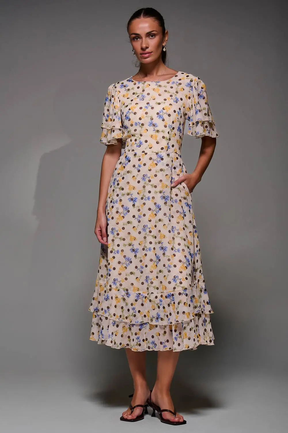The Frill Detail Chiffon Midaxi Dress by Jolie Moi features a round neckline, a flattering tie waist, and a concealed zip at the back. Soft, 2-layer short flowy sleeves and a double-frilled hem add a graceful, romantic touch. Finished with practical side pockets, its a versatile piece perfect for both day and evening occasions. | Jolie Moi Women's Frill Detail Chiffon Midaxi Dress in Beige | Size: 10