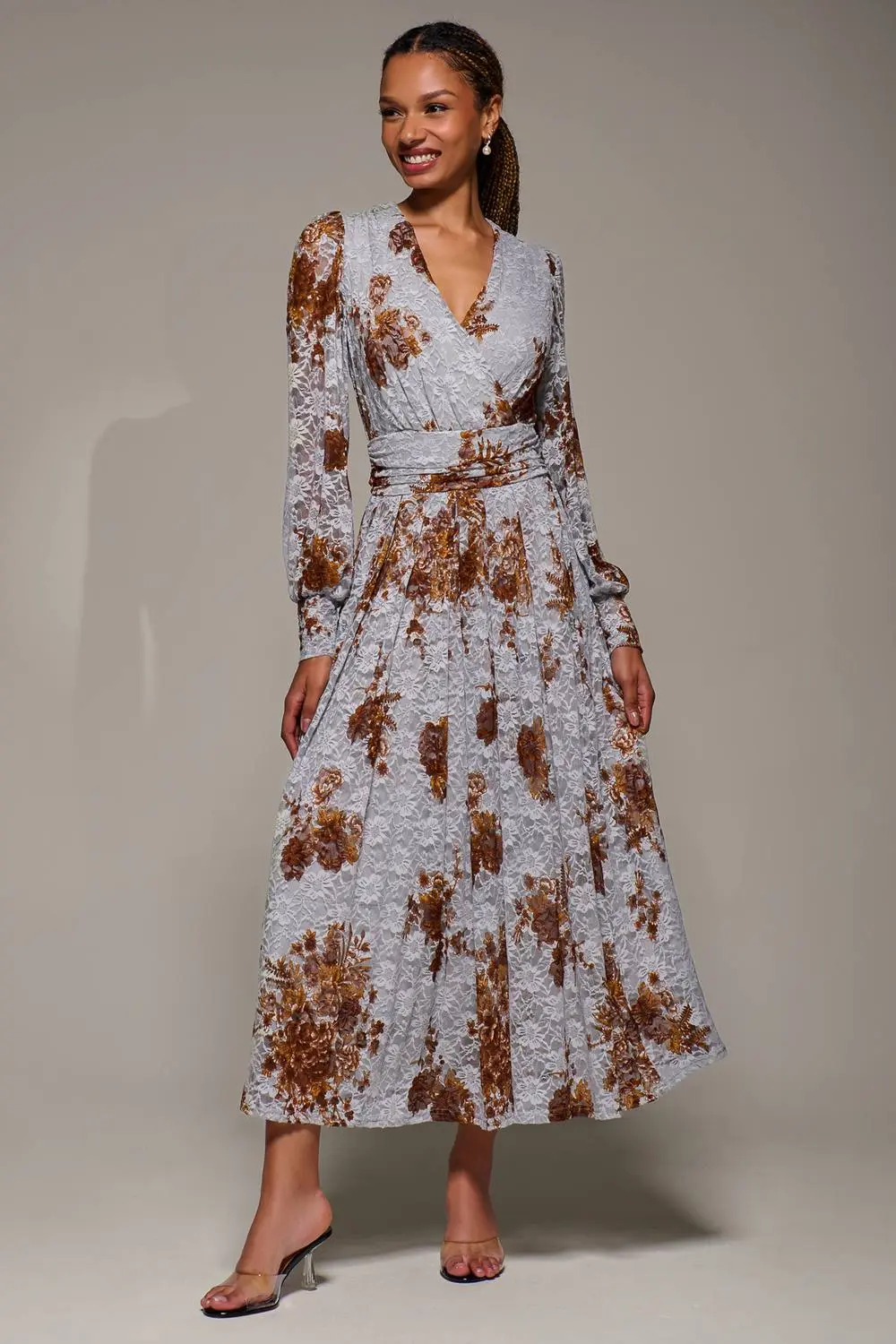 Long Sleeve Printed Lace Midaxi Dress by Jolie Moi features a wrap-front V neckline, long sleeves with fitted cuffs, gentle gathers at the waistband for a soft, draped look. Pleated details along the waistline and a tie to cinch the waist, while two side pockets add a practical touch. | Jolie Moi Women's Long Sleeve Printed Lace Midaxi Dress in Blue | Size: 14