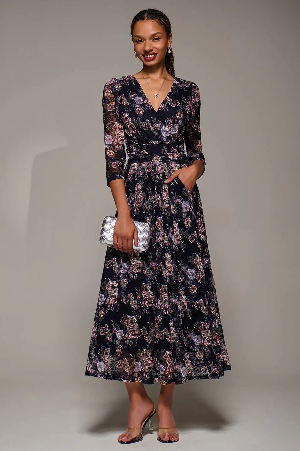 Three Quarter Sleeve Printed Lace Maxi Dress by Jolie Moi features a flattering wrap-front V neckline, a concealed zip at the back for a seamless fit, and two convenient pockets. Gentle pleats around the waistband create subtle shaping, enhancing the silhouette with an elegant touch | Jolie Moi Women's Three Quarter Sleeve Printed Lace Maxi Dress in Navy | Size: 12