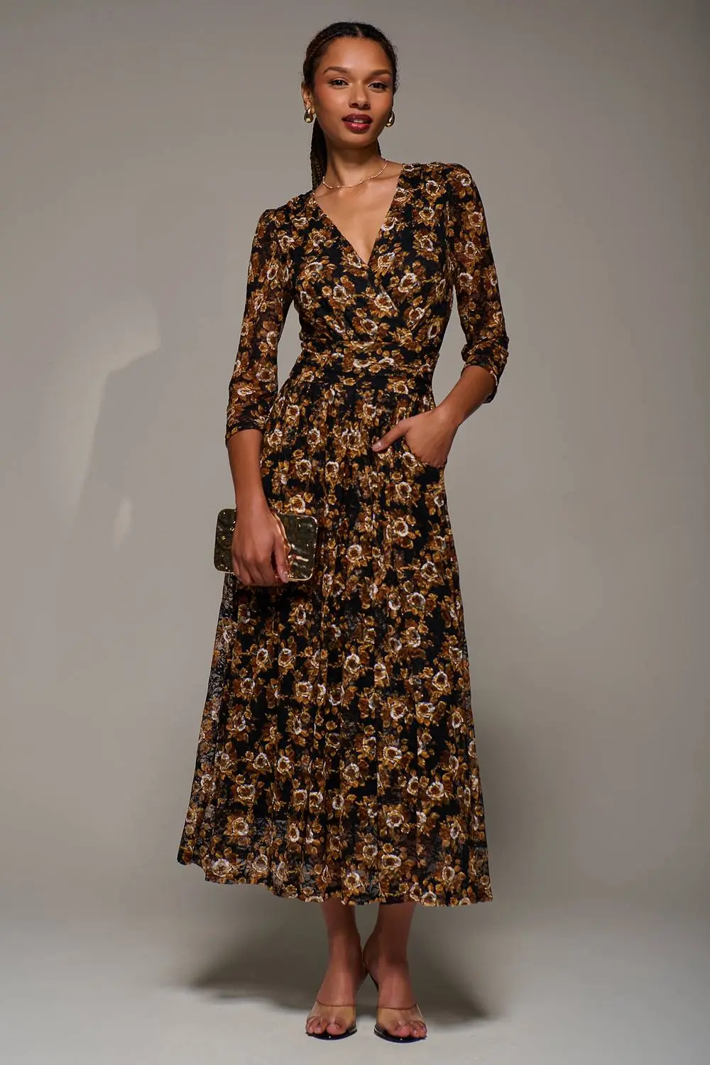 Three Quarter Sleeve Printed Lace Maxi Dress by Jolie Moi features a flattering wrap-front V neckline, a concealed zip at the back for a seamless fit, and two convenient pockets. Gentle pleats around the waistband create subtle shaping, enhancing the silhouette with an elegant touch | Jolie Moi Women's Three Quarter Sleeve Printed Lace Maxi Dress in Black | Size: 14