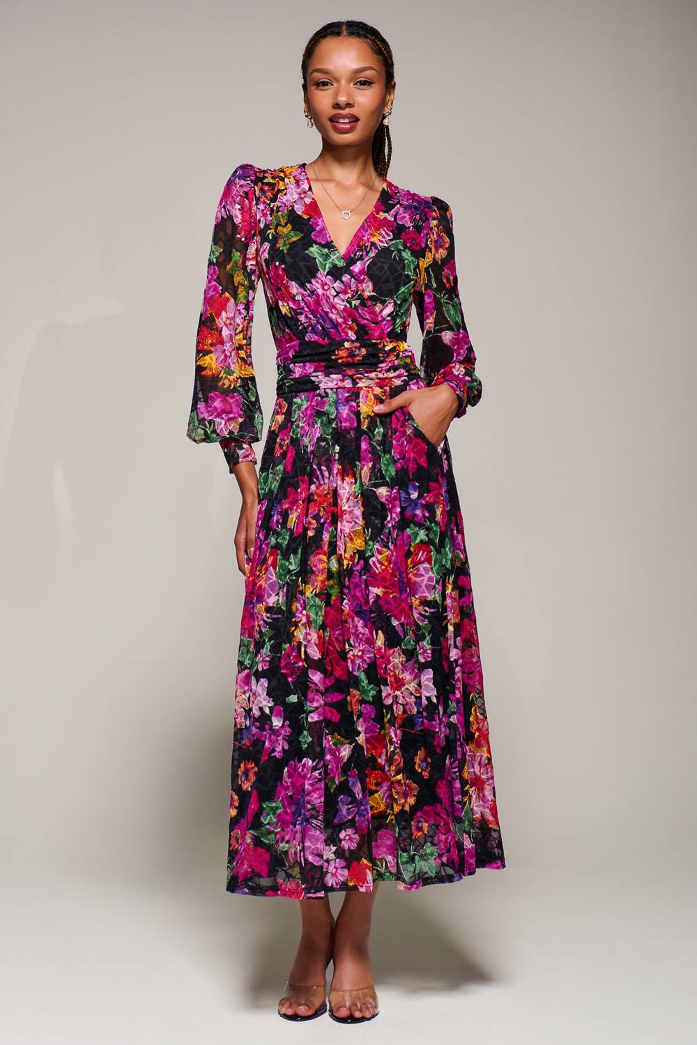 Long Sleeve Printed Lace Midaxi Dress by Jolie Moi features a wrap-front V neckline, long sleeves with fitted cuffs, gentle gathers at the waistband for a soft, draped look. Pleated details along the waistline and a tie to cinch the waist, while two side pockets add a practical touch. | Jolie Moi Women's Long Sleeve Printed Lace Midaxi Dress | Size: 10