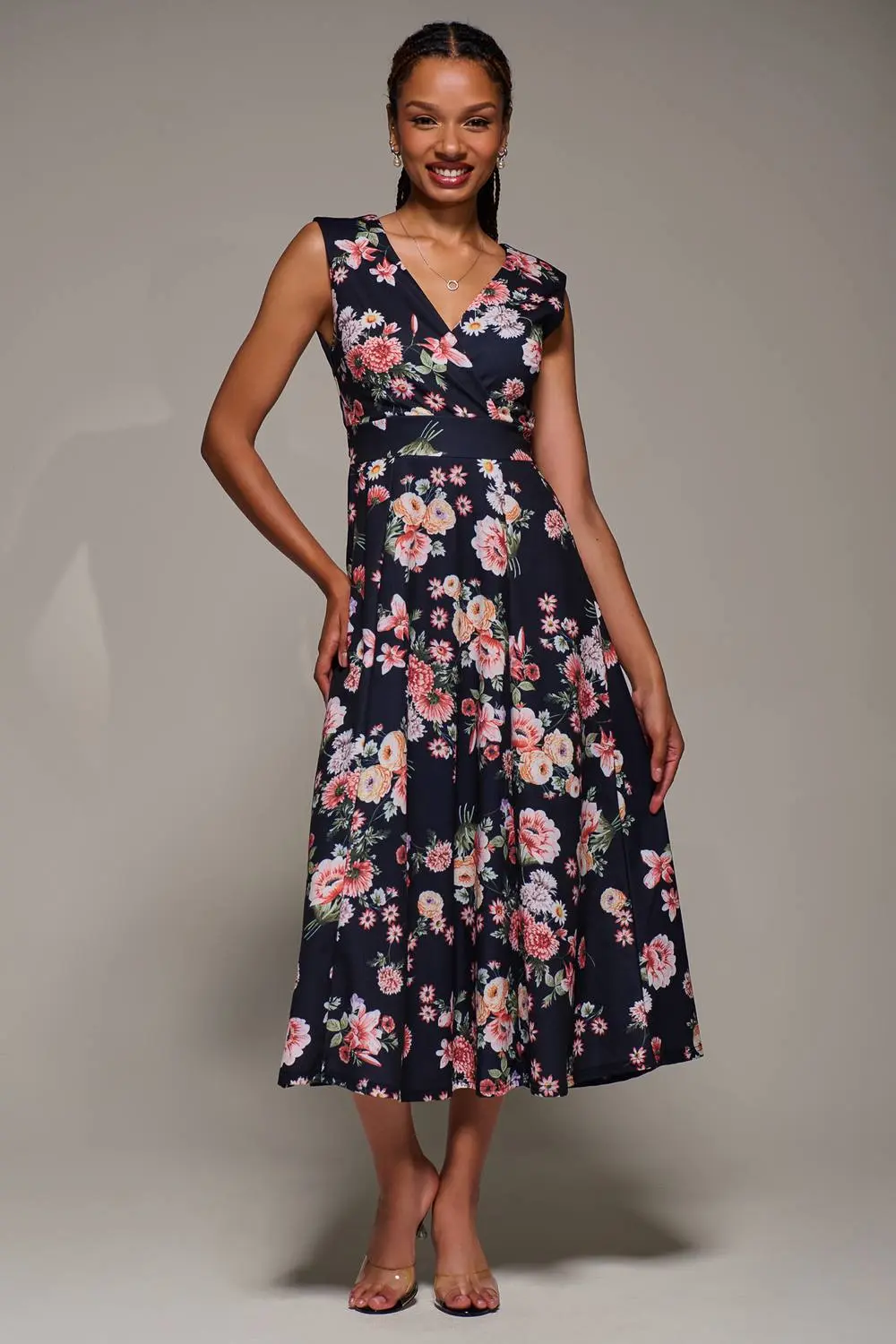 The V-Neck Fit & Flare Scuba Midaxi Dress by Jolie Moi. Featuring a wrap V-neck and sleeveless design, the dress has a defined waistband that ties at the back. It offers a flattering fit & flare silhouette, falling to a Midaxi length. Finished with a concealed zip and practical pockets, this dress is perfect for effortless elegance. | Jolie Moi Women's V-Neck Fit & Flare Scuba Midaxi Dress in Black | Size: 10
