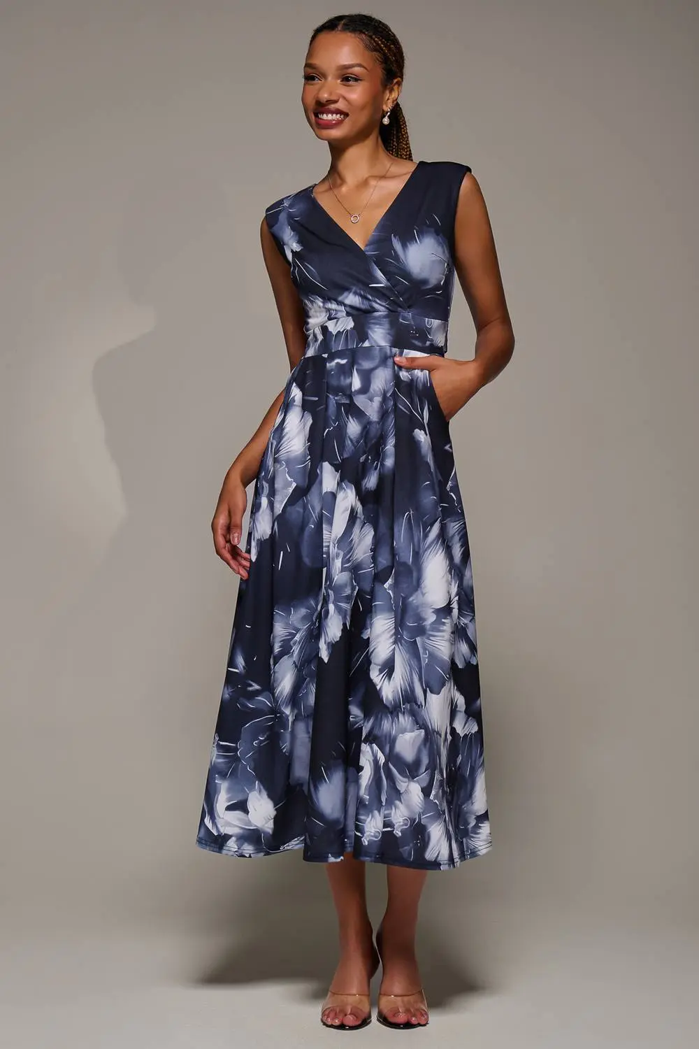 The V-Neck Fit & Flare Scuba Midaxi Dress by Jolie Moi. Featuring a wrap V-neck and sleeveless design, the dress has a defined waistband that ties at the back. It offers a flattering fit & flare silhouette, falling to a Midaxi length. Finished with a concealed zip and practical pockets, this dress is perfect for effortless elegance. | Jolie Moi Women's V-Neck Fit & Flare Scuba Midaxi Dress in Dark Navy | Size: 8