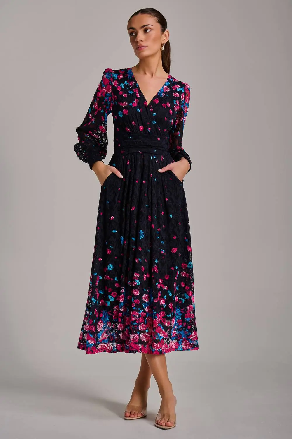 The Long Sleeve Print Lace Maxi Dress by Jolie Moi features an elegant V-neckline and long cuffed sleeves. Made from delicate lace, it falls to a flattering maxi length. Fully lined for comfort and coverage, the dress includes a thick waistband to define the waist, discreet side pockets, and a concealed zip for a seamless finish. | Jolie Moi Women's Long Sleeve Print Lace Maxi Dress | Size: 10