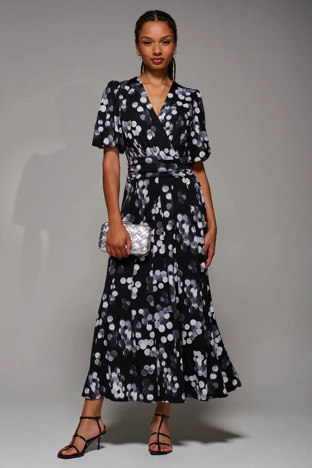 The Puff Sleeve Maxi Dress from Jolie Moi features short puff sleeves and a wrap V-neckline, crafted from soft jersey fabric for all-day comfort. A thick waistband with a back tie shapes the silhouette, while discreet pockets add practicality. Fully lined for a smooth and flattering fit, the pleated maxi skirt flows gracefully to create an elegant, feminine finish. | Jolie Moi Women's Puff Sleeve Jersey Maxi Dress | Size: 10