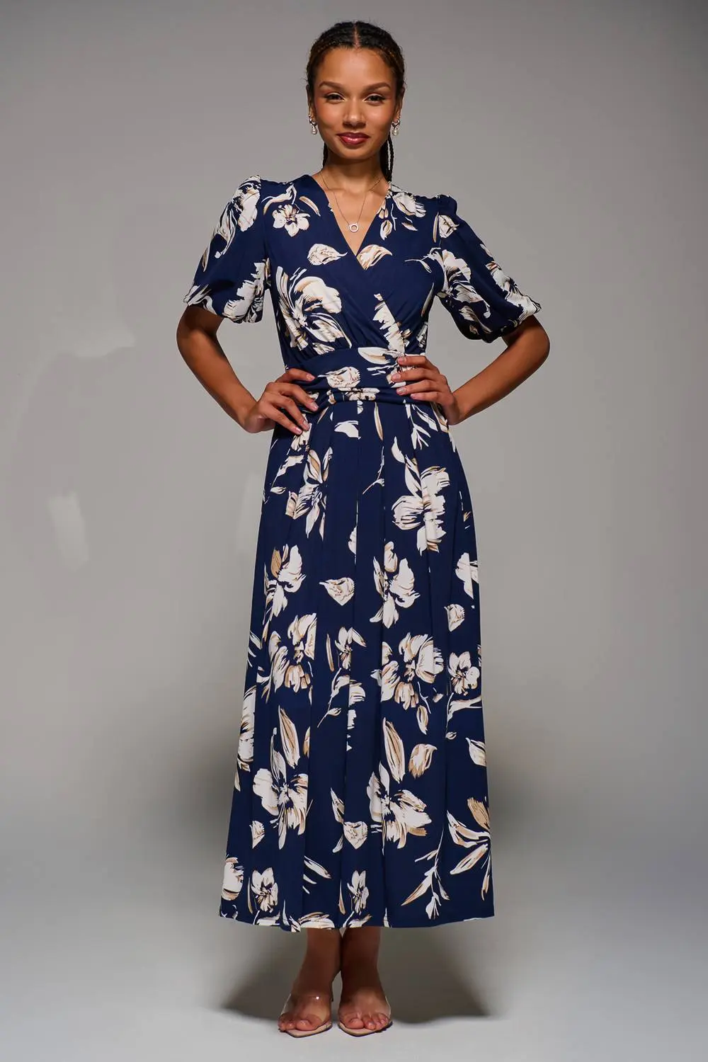 The Puff Sleeve Maxi Dress from Jolie Moi features short puff sleeves and a wrap V-neckline, crafted from soft jersey fabric for all-day comfort. A thick waistband with a back tie shapes the silhouette, while discreet pockets add practicality. Fully lined for a smooth and flattering fit, the pleated maxi skirt flows gracefully to create an elegant, feminine finish. | Jolie Moi Women's Puff Sleeve Jersey Maxi Dress in Navy | Size: 8