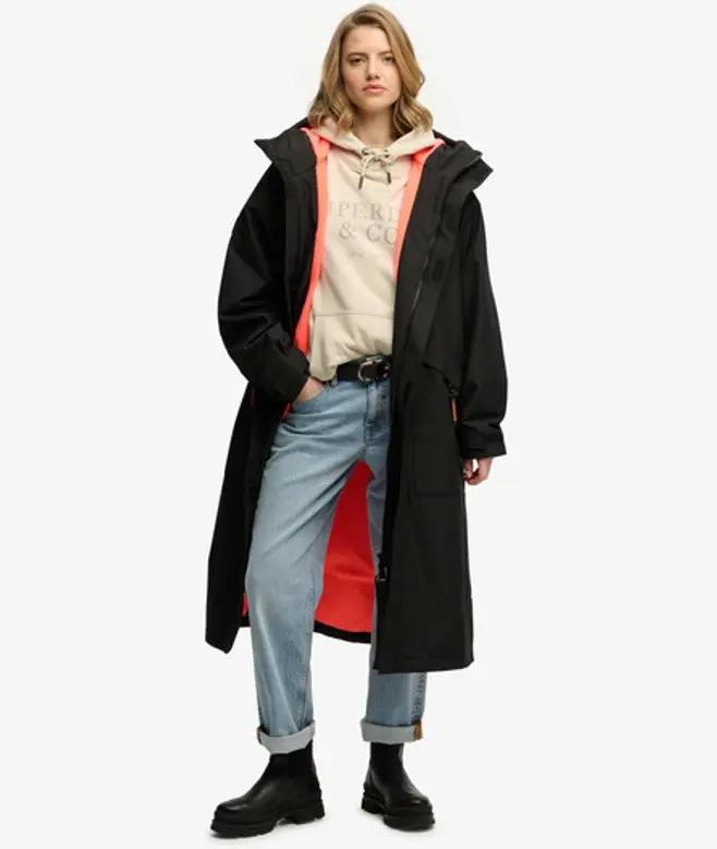 Boxy fit - looser and more flowing, for those times when you need room to move One Size - Chest 69.5cm, length 117 cm Durable water repellency - This fabric has been coated with an advanced water-resistant finish Hooded with bungee adjustable drawcord Two way zip fastening with hook and loop strom flap closure Hook and loop adjustable cuffs with a borg internal lining Two external and one internal pocket all with zip fastening Signature badge on arm Embroidered logo down the chest Signature text on the back Let your style roam free with the Ultimate Superdry Robe. Designed for comfort and convenience, it features two deep external pockets to keep your essentials close, and a two-way zip with storm flap for added protection. The DWR coating shields you from unexpected showers, while the plush borg lining wraps you in warmth and softness. Its roomy, boxy fit makes layering effortless. From dog walks to wild swims… it's ready when you are.