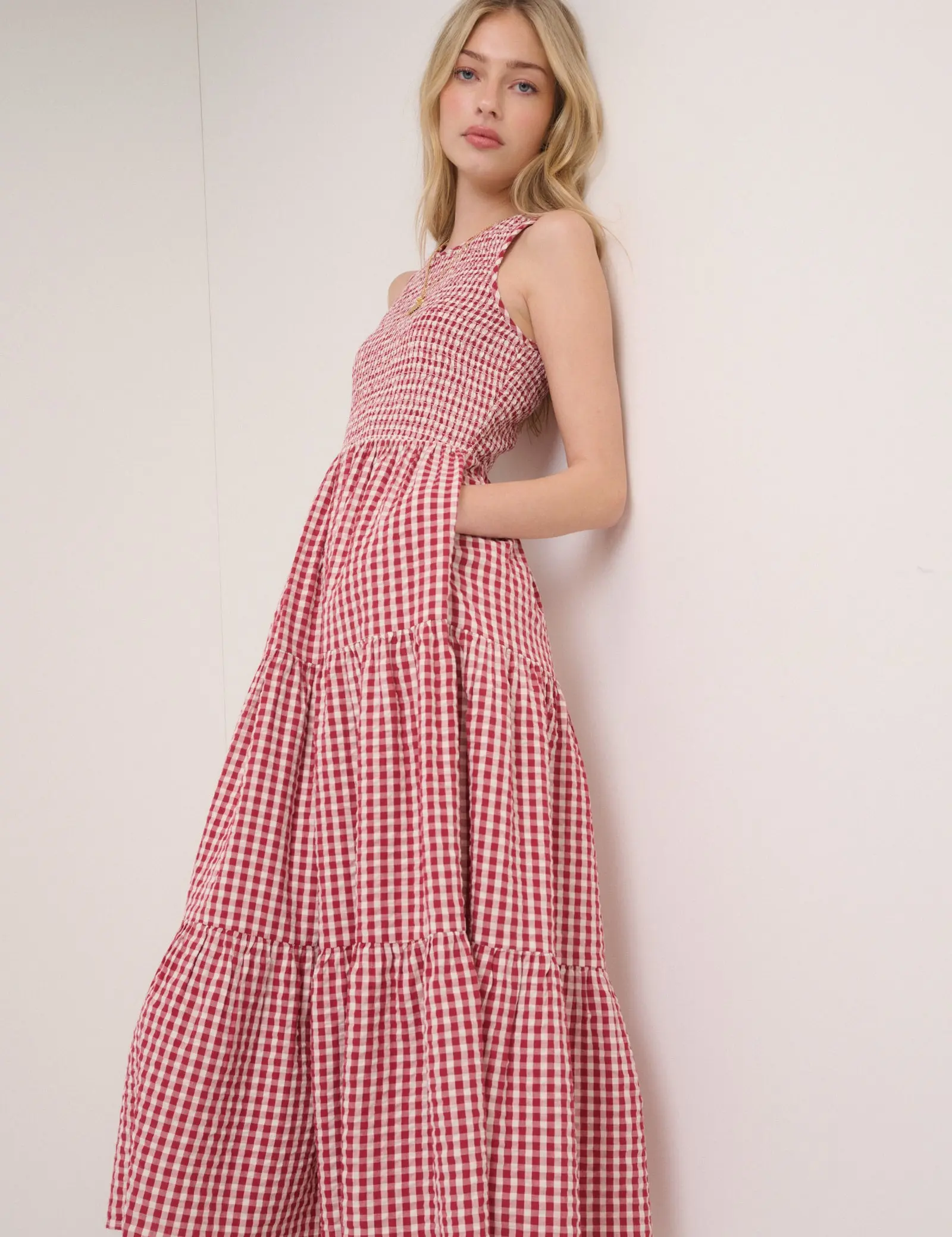 Round neck Sleeveless Shirred bodice for the perfect fit Elasticated waist Keyhole back with button fastening Side pockets Relaxed skirt Tiered skirt Size tip: we recommend your usual size
