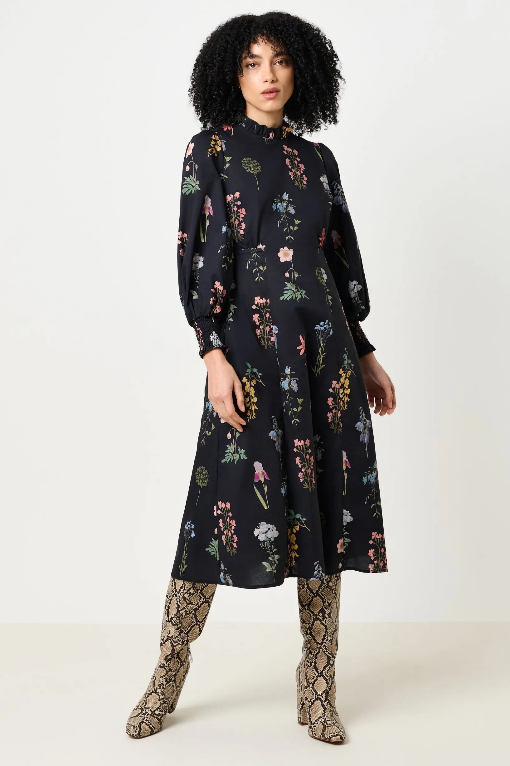 Meet your new desk-to-dinner essential. The Jessie pairs a flattering midi silhouette with a deep navy based botanical flower press print for understated elegance. While the versatile cut means you'll reach for it again and again—whether you're heading to the office or out for the evening. One dress, endless possibilities.. Self frill collar.. Back zip opening.. Shirred elastic cuffs. Side seam pockets.. Fully Lined.. 100% COTTON, LINING 100% COTTON. Cool machine wash. Wash with similar colours. Do not bleach. Do not tumble dry. Warm iron on reverse.. MODEL 5ft 8" 173cms, Size UK 8