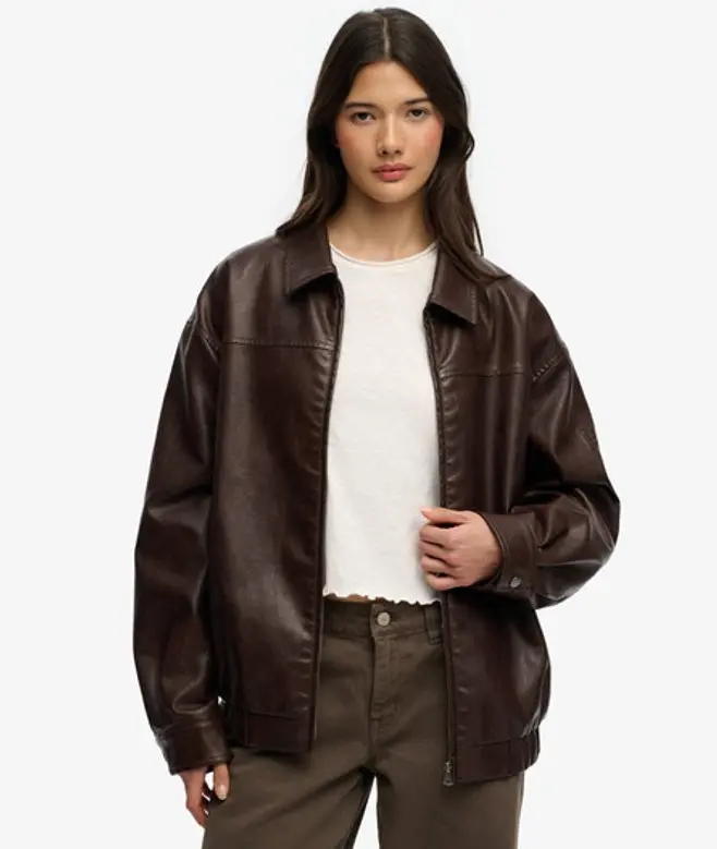 Oversized fit - exaggerated and super relaxed, let your style flow Regular collar, popper cuffs and elasticated hemline Two external pockets Fully lined Zip fastening Embossed Superdry logo on the sleeve Embrace your style and let it flow with our Collared Oversized Bomber Jacket, the ultimate piece your wardrobe didn't know it needed. Designed in a trendy oversized cut and finished with a faux leather look, it brings that effortless cool that elevates every outfit with a touch of edge.