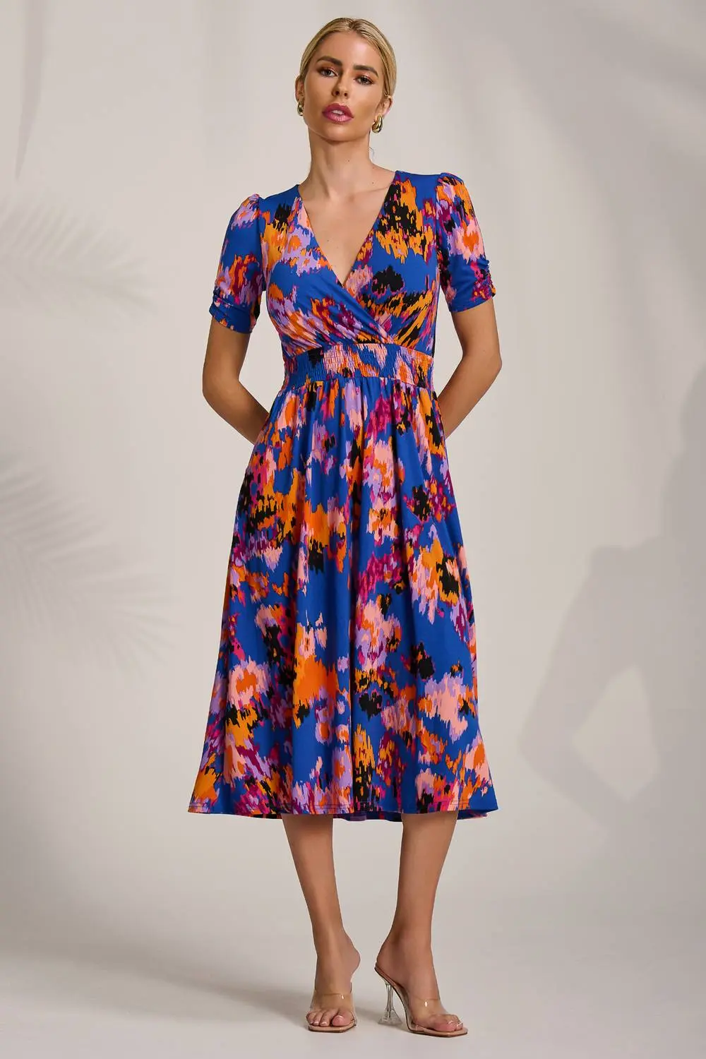 The Printed Jersey Midi Dress from Jolie Moi. Made from soft jersey, this midi dress features short ruched sleeves, a wrap V-neckline, and a shirred thick waistband that flatters the waist. Fully lined for comfort, the dress includes discreet pockets and a pleated skirt for elegant movement. | Jolie Moi Women's Short Sleeve Printed Jersey Midi Dress in Blue | Size: 20
